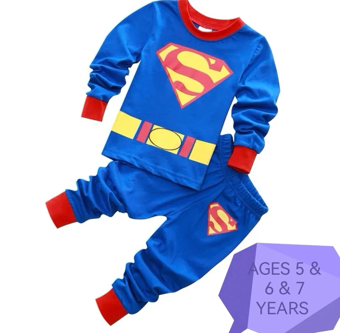 Super cute Superman pajamas for kids! These are perfect for ages 5, 6, and 7. The set includes a long-sleeved top and pants, both in bright blue with the Superman logo