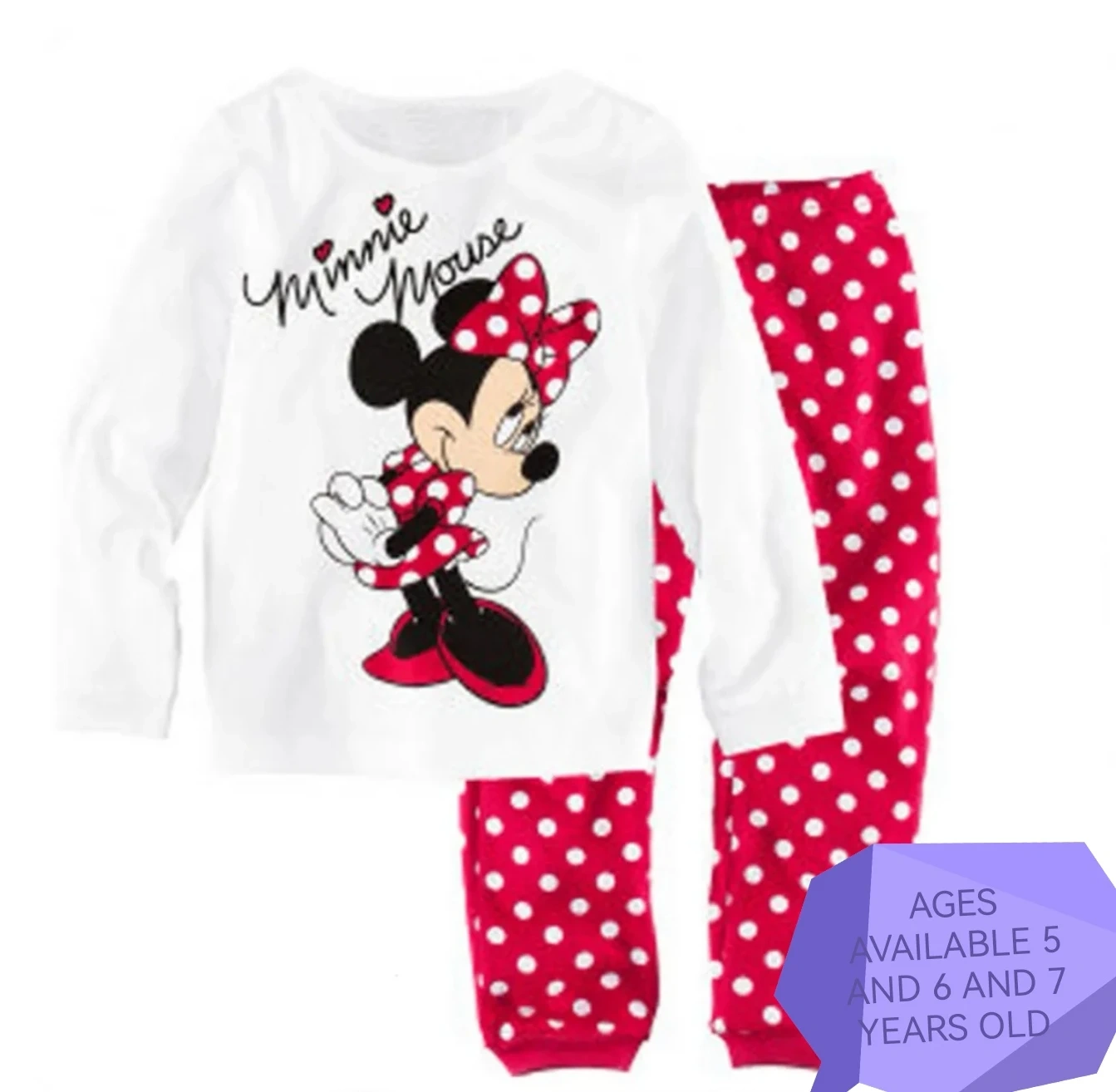 Super cute Minnie Mouse pajamas! Perfect for ages 5, 6, and 7. The set includes a long-sleeve white top with a Minnie Mouse graphic and red polka dot pants
