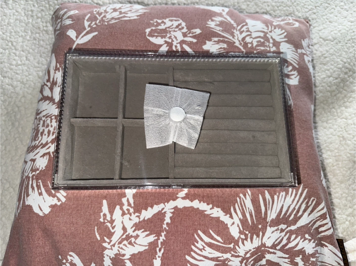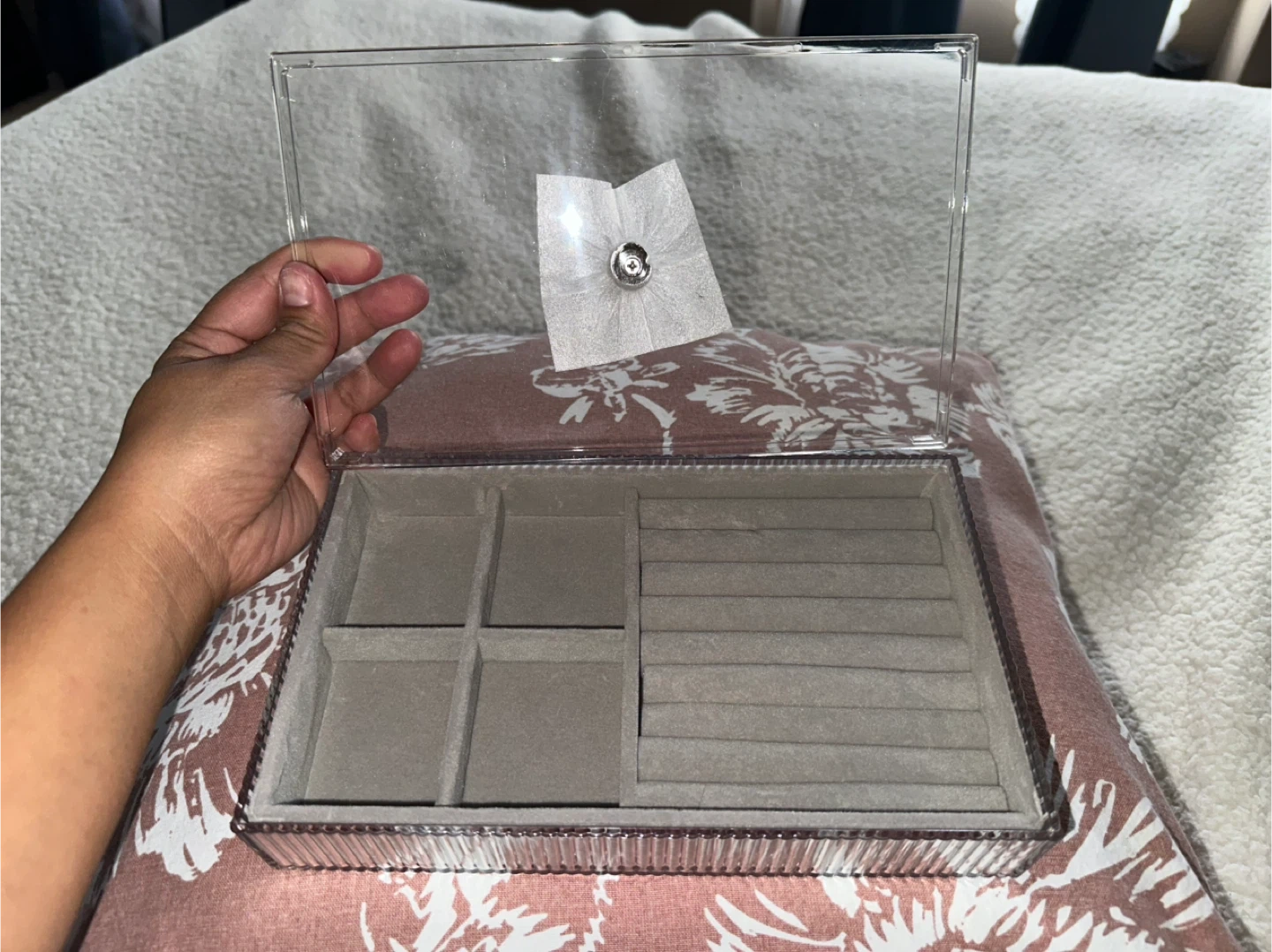 Selling a clear acrylic jewelry box organizer. It has a lid and several compartments inside, perfect for keeping your jewelry neat and tidy