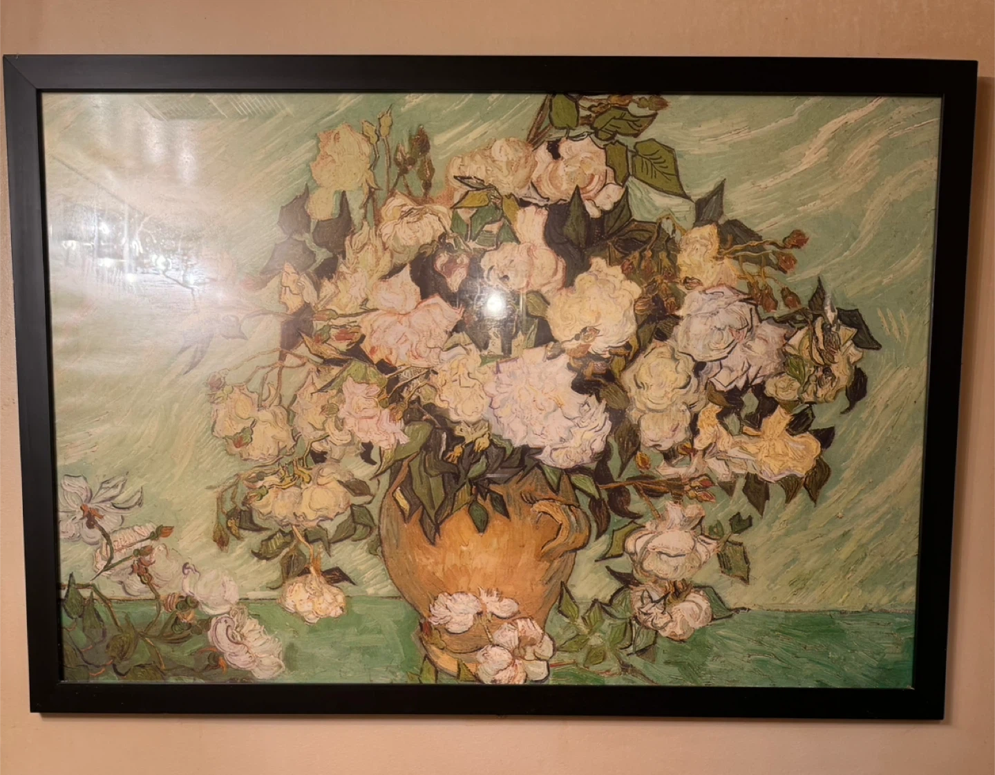 Selling a framed print of Van Gogh's "Roses". The frame is black and the print is in good condition. It's a beautiful piece to add to any room