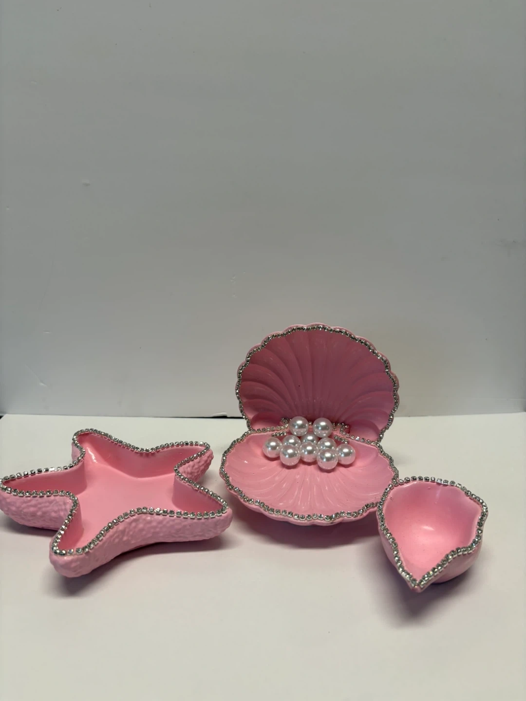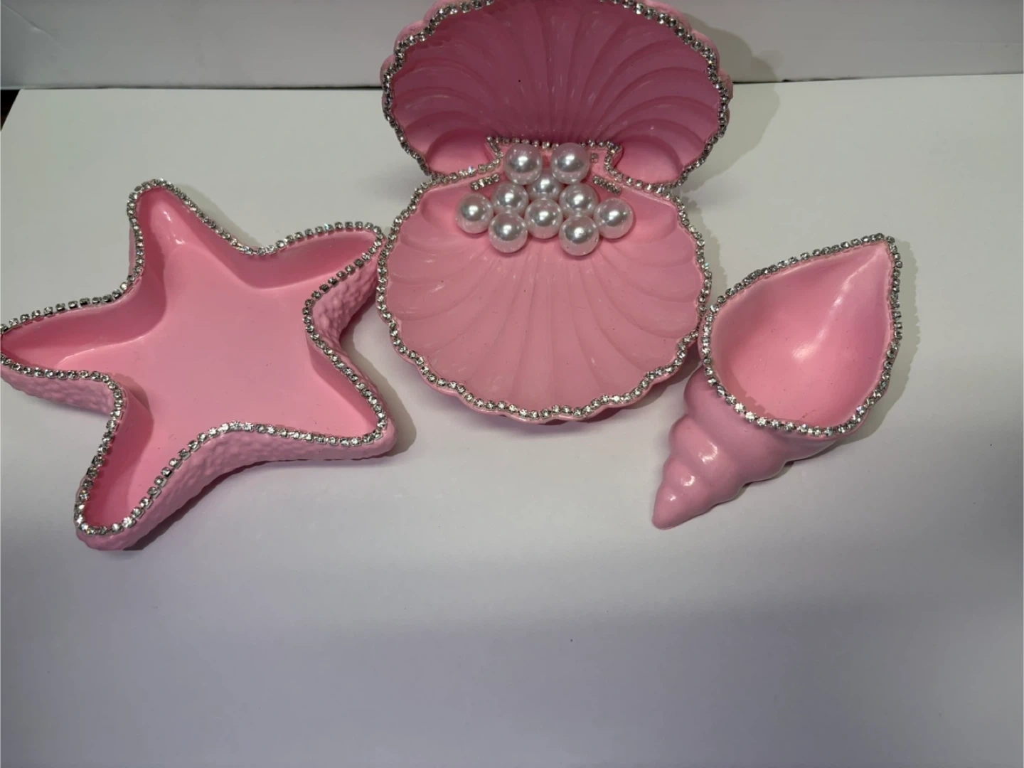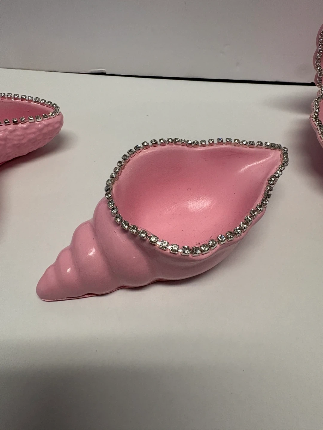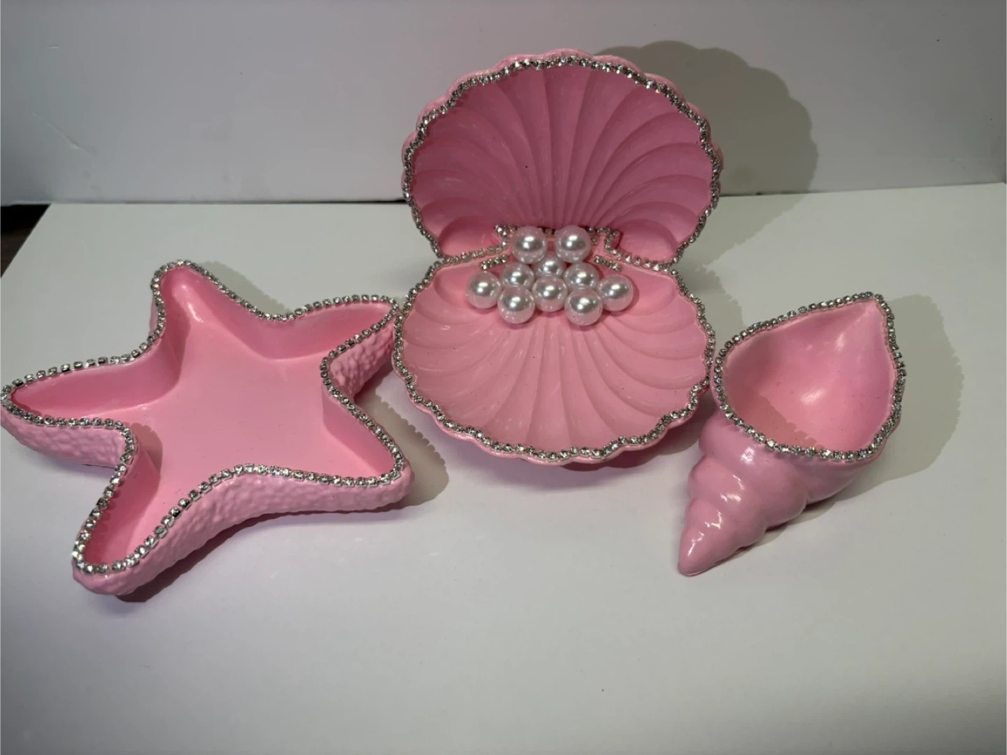 Bring a touch of the ocean to your home with this beautiful, handmade seashell dish set. Crafted from high-quality Jesmonite, this decorative piece captures the enchanting spirit of the sea. The set includes three unique shells: a stunning scallop shell that opens to reveal a cluster of faux pearls, a graceful spiral conch shell and a starfish shell. The three pieces feature a delicate, hand-painted light pink finish and are adorned with a border of sparkling rhinestones and silver leafing, adding a touch of elegant bling. This versatile set can serve as a functional trinket dish for rings, earrings, or small treasures, a catch-all tray on your entryway table. It’s also a perfect decorative accent for a bedroom vanity, living room shelf, or any space that needs a little coastal charm. This handmade seashell set is a perfect gift for mermaid lovers, coastal enthusiasts, or anyone who appreciates unique, handmade home decor. Due to the handmade nature of these items, each one is truly unique and may have slight variations in color and texture, which adds to its one-of-a-kind charm.