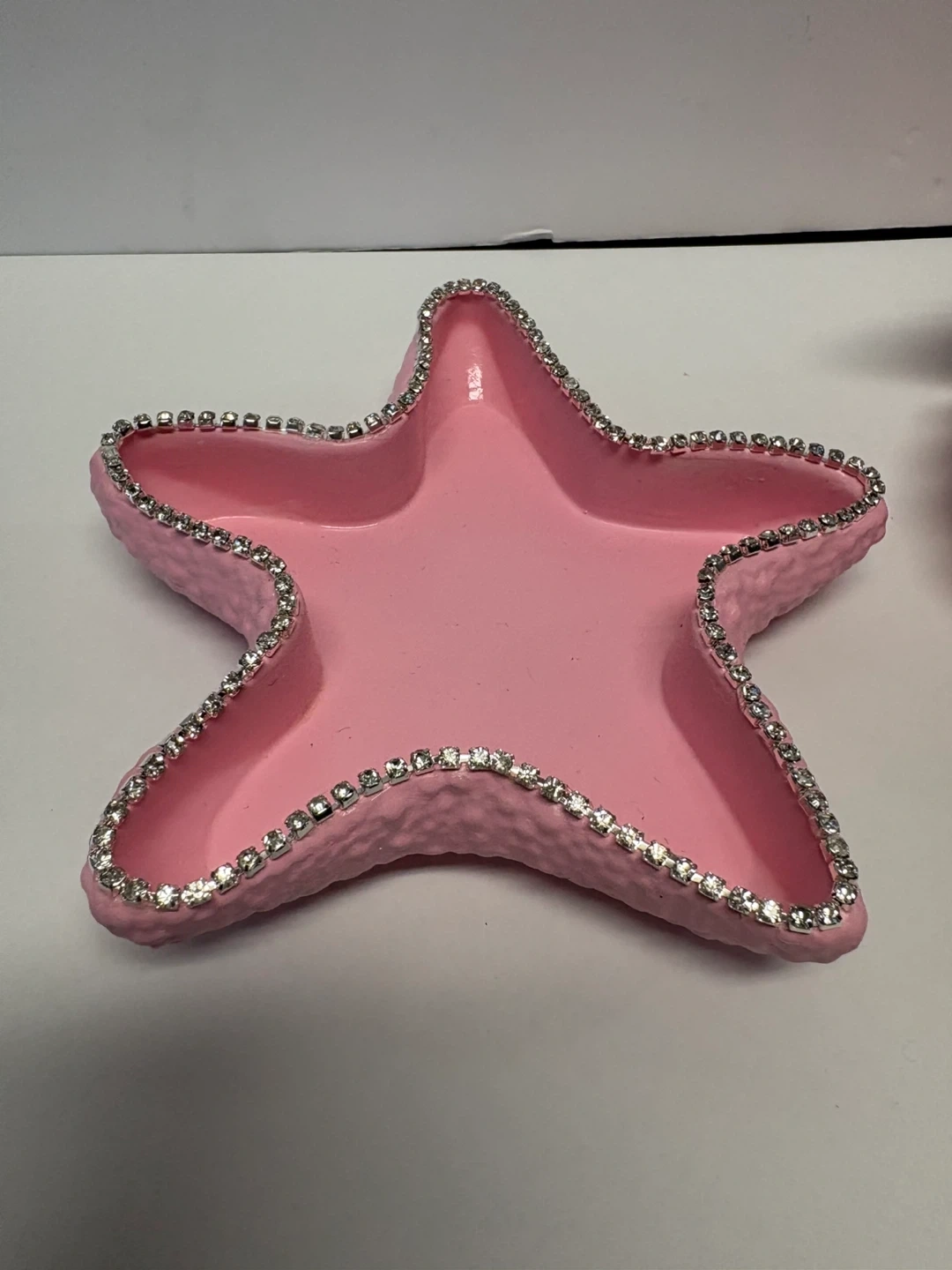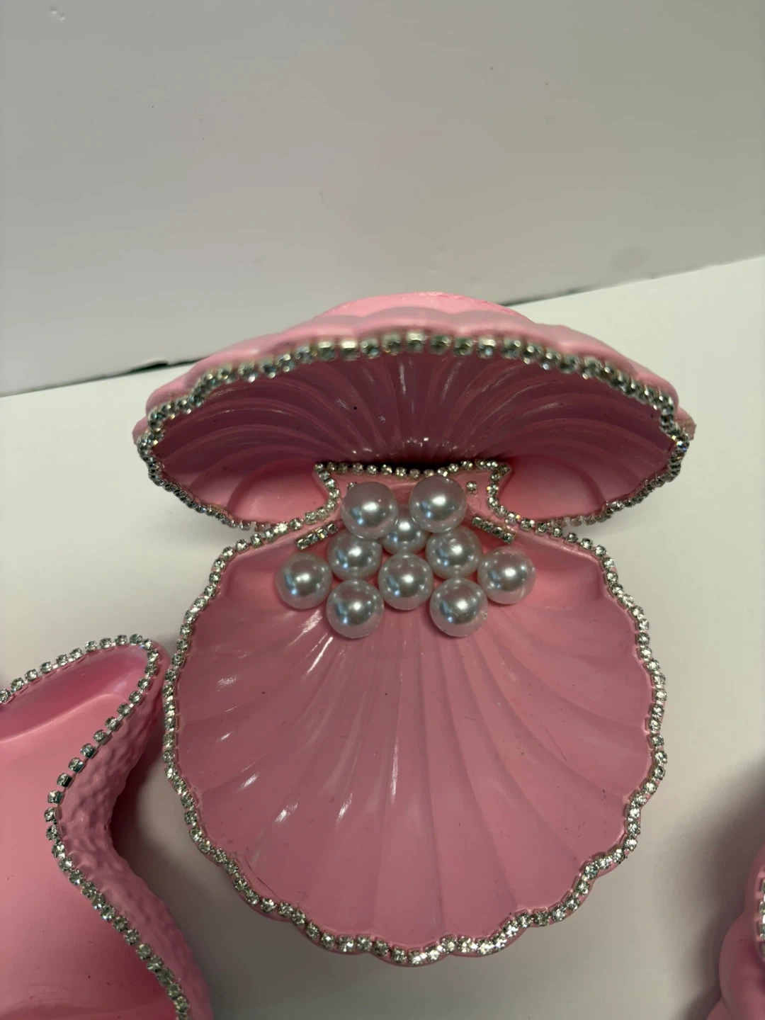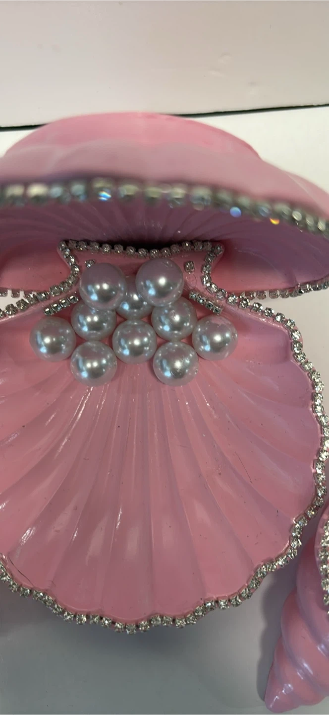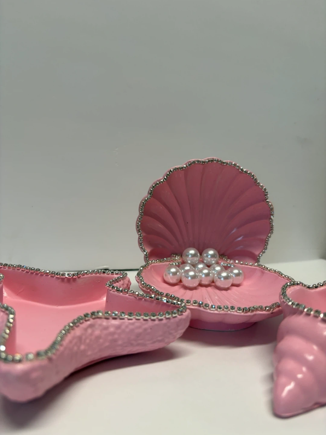 Bring a touch of the ocean to your home with this beautiful, handmade seashell dish set. Crafted from high-quality Jesmonite, this decorative piece captures the enchanting spirit of the sea. The set includes three unique shells: a stunning scallop shell that opens to reveal a cluster of faux pearls, a graceful spiral conch shell and a starfish shell. The three pieces feature a delicate, hand-painted light pink finish and are adorned with a border of sparkling rhinestones and silver leafing, adding a touch of elegant bling. This versatile set can serve as a functional trinket dish for rings, earrings, or small treasures, a catch-all tray on your entryway table. It’s also a perfect decorative accent for a bedroom vanity, living room shelf, or any space that needs a little coastal charm. This handmade seashell set is a perfect gift for mermaid lovers, coastal enthusiasts, or anyone who appreciates unique, handmade home decor. Due to the handmade nature of these items, each one is truly unique and may have slight variations in color and texture, which adds to its one-of-a-kind charm.