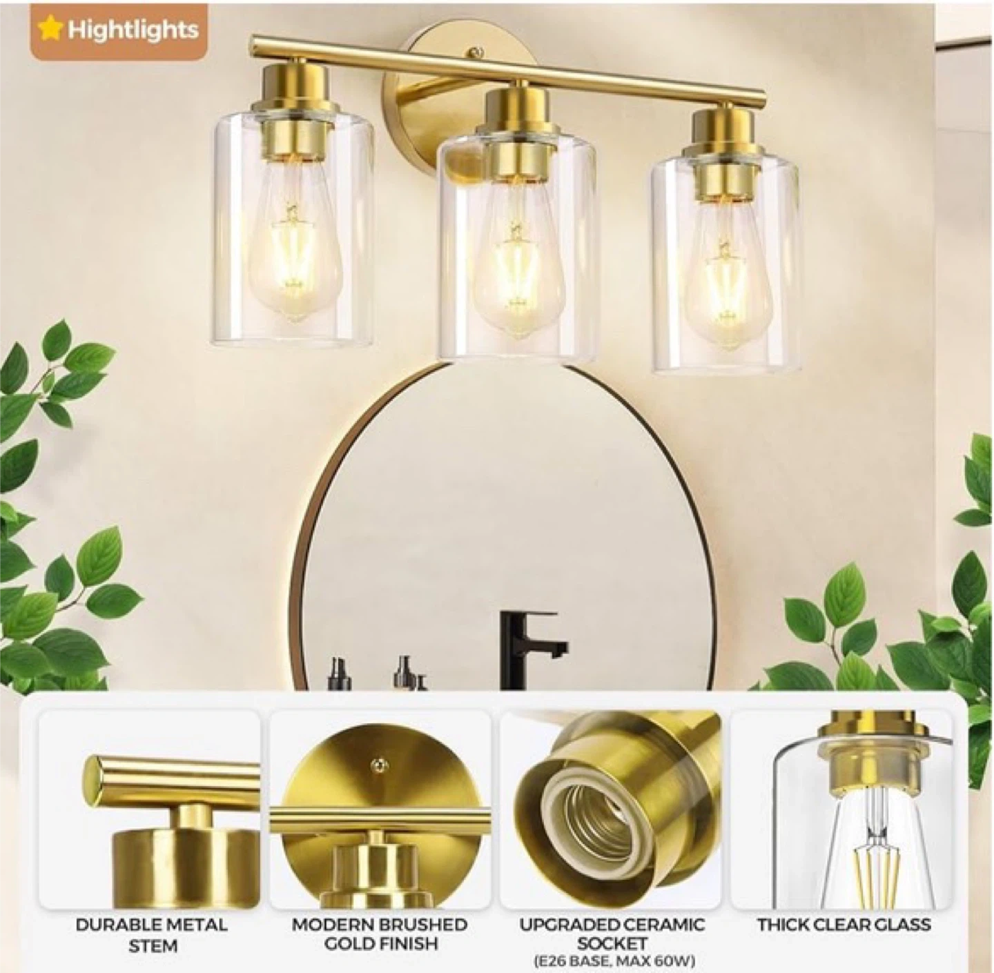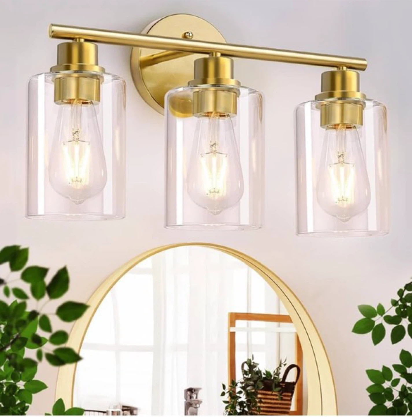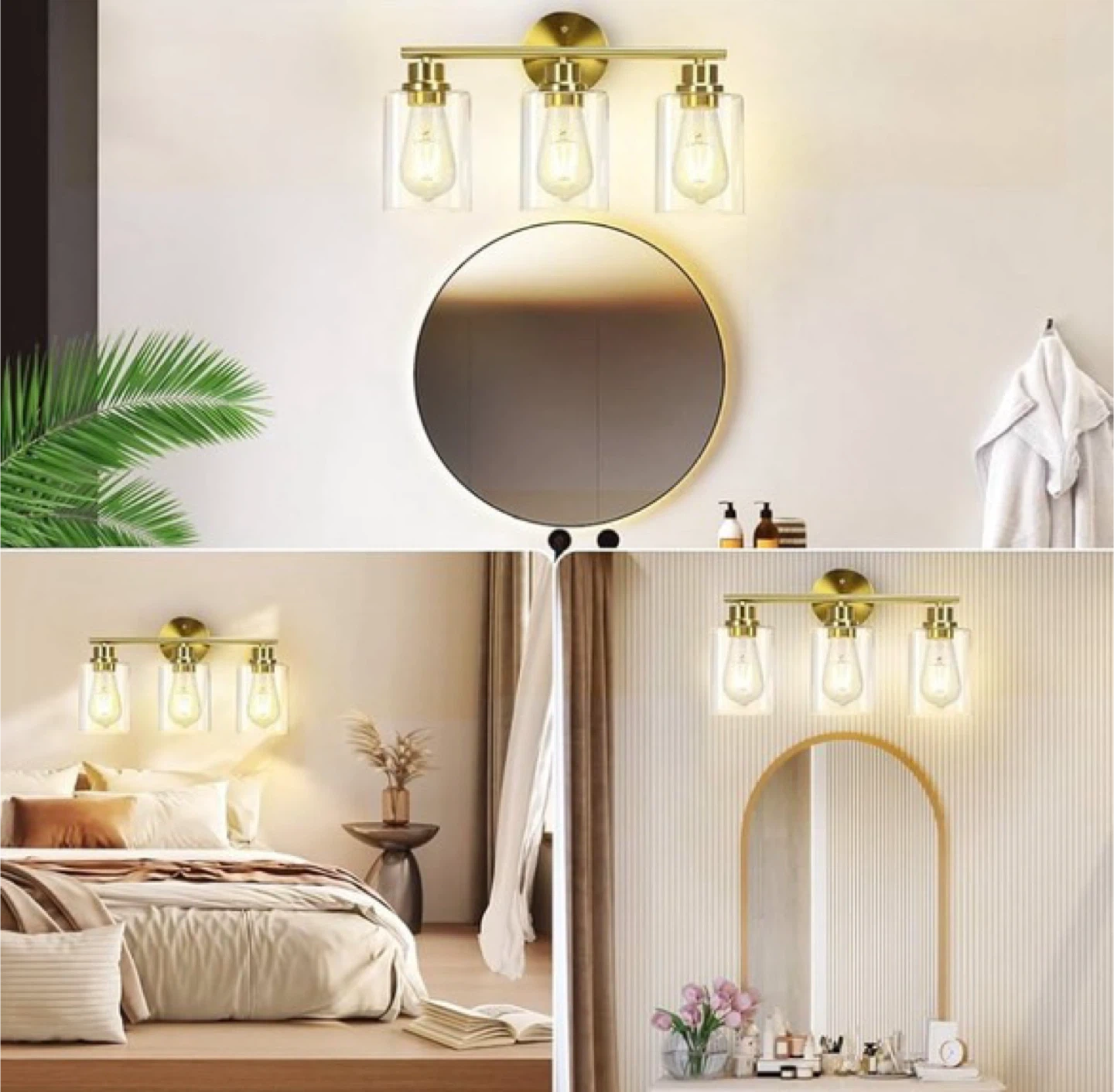CRIRY 3-Light Brushed Gold Bathroom Vanity Lighting Fixture Over Mirror, Modern Wall Sconces with Clear Glass Shade, Wall Mounted Lamp for Bedroom Hallway Living Room Kitchen,Bulb Not Included