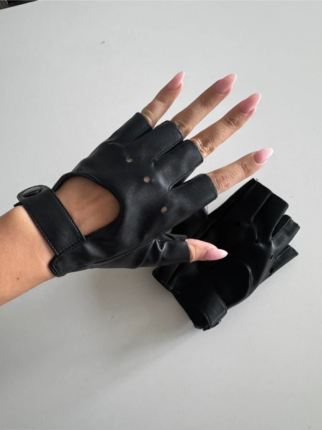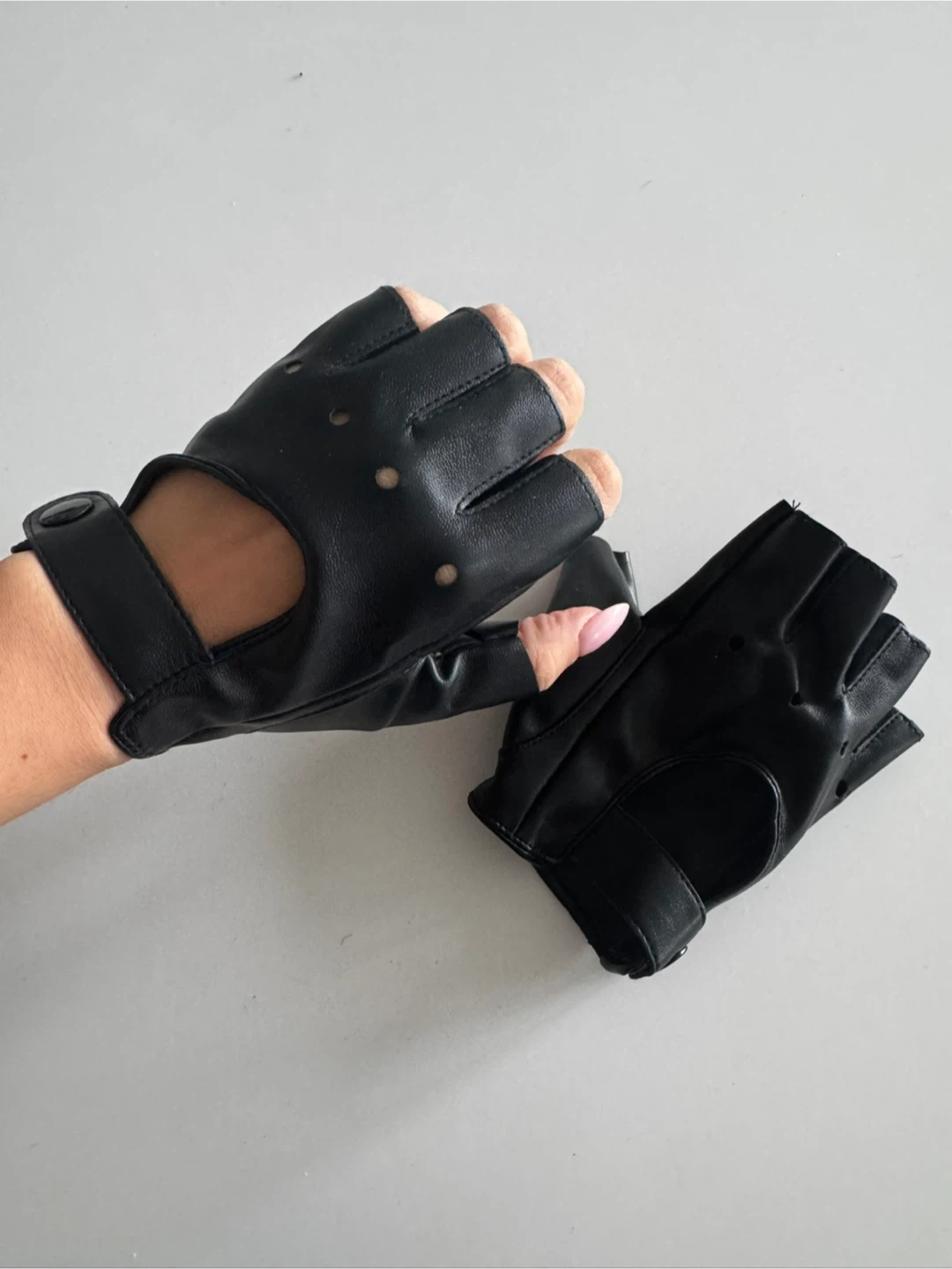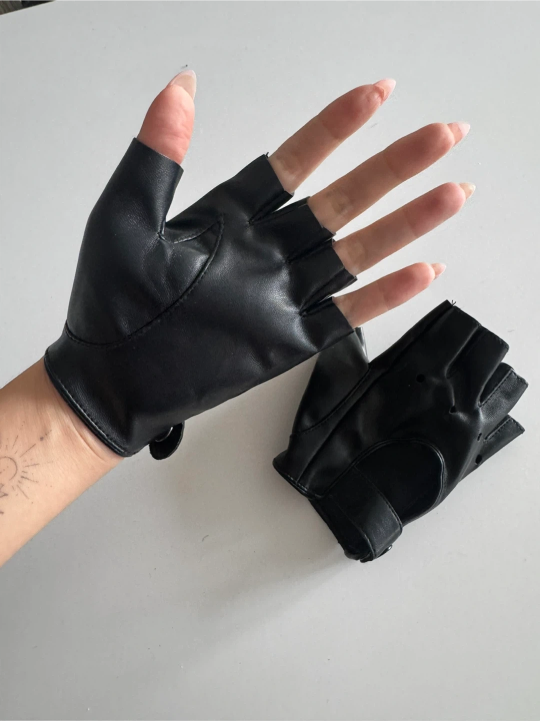 Selling a pair of black leather fingerless gloves. They're in great condition and perfect for adding a bit of edge to your outfit or for activities where you need your fingers free. The material is soft and comfortable, making them easy to wear. Great for driving or motorcycle riding