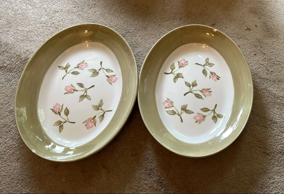 Two 14 inch oval serving platters with a charming floral design! They have a light green trim and delicate pink roses. Perfect for your next dinner party or special occasion. There is a small chip on one of the platters.