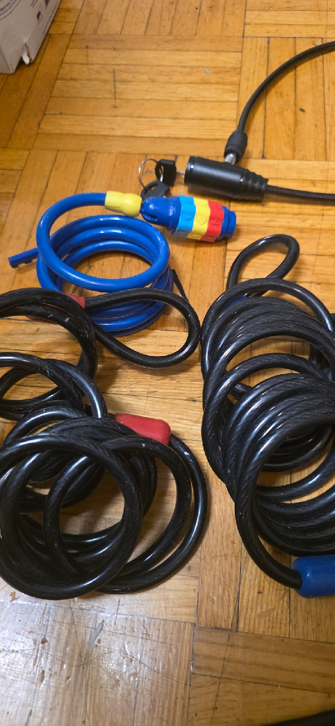 Selling a bundle of bike locks and lights! Includes a blue cable lock, black cable locks, and various bike lights. Perfect for keeping your bike safe and visible! 9 bicycle items for 40$