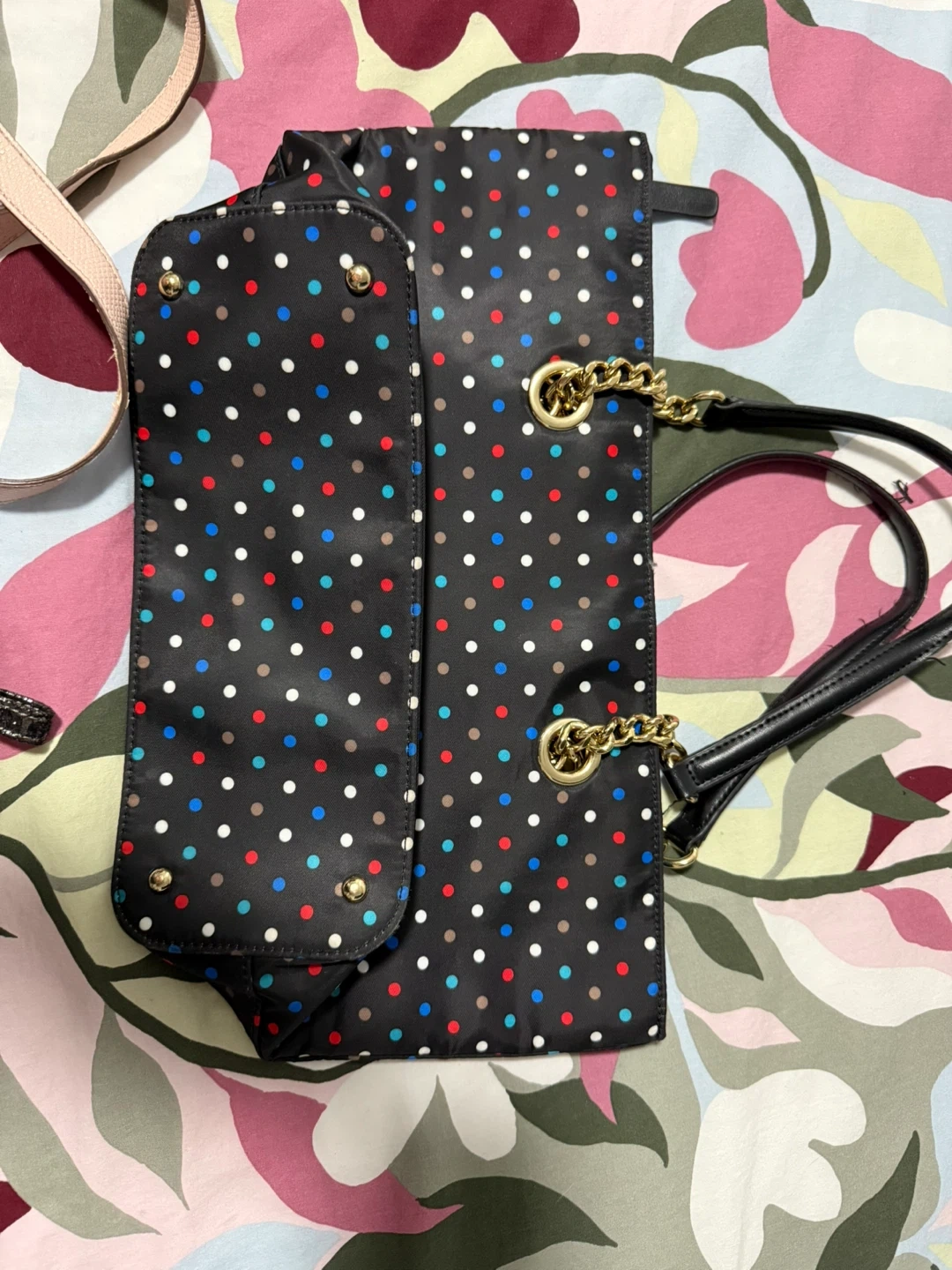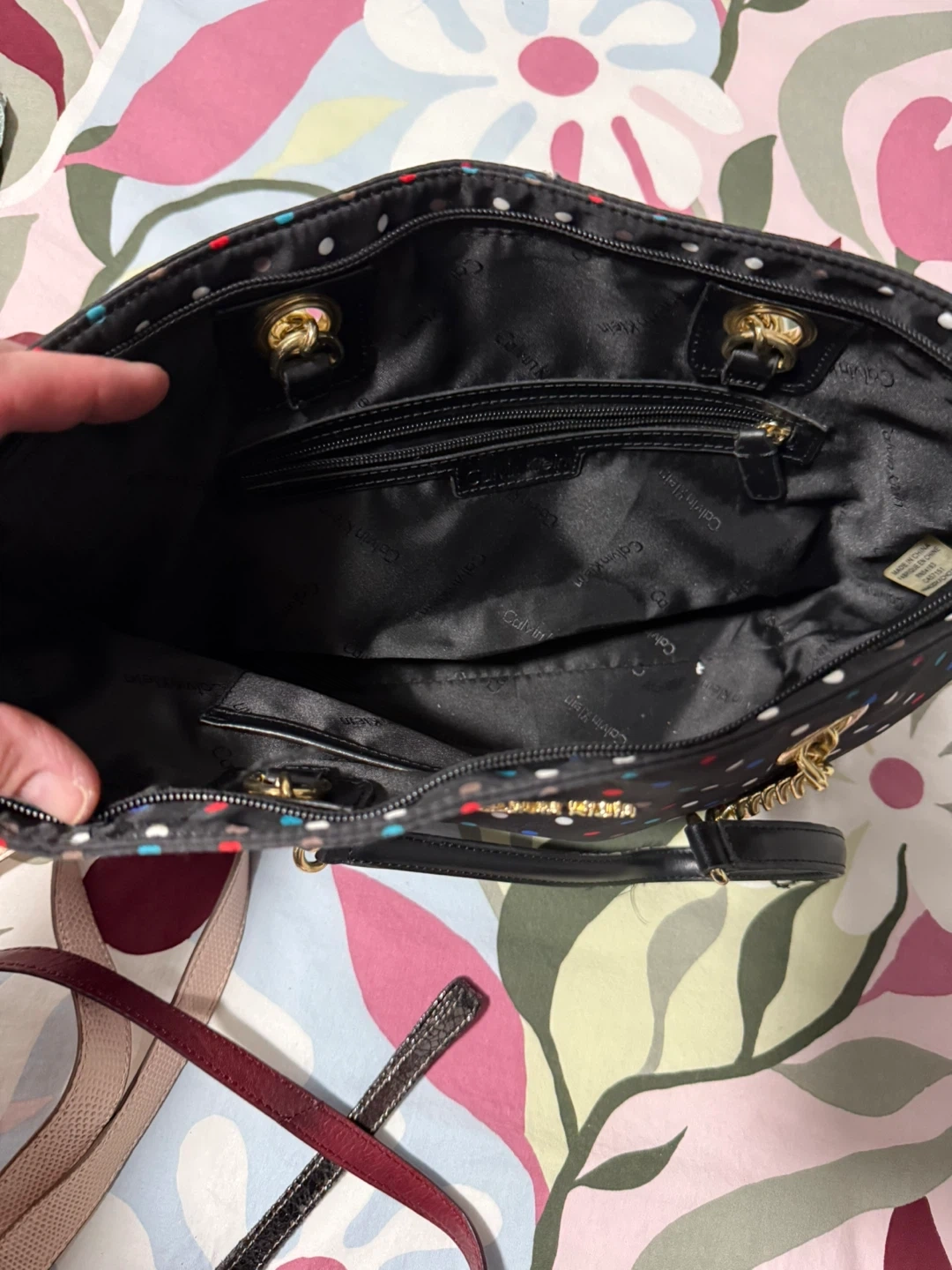 Cute Calvin Klein tote bag with a fun polka dot pattern! It features gold chain detailing and black handles. The inside has a zipper pocket for your valuables. In excellent condition no wear and very clean inside and out. From non smoking house