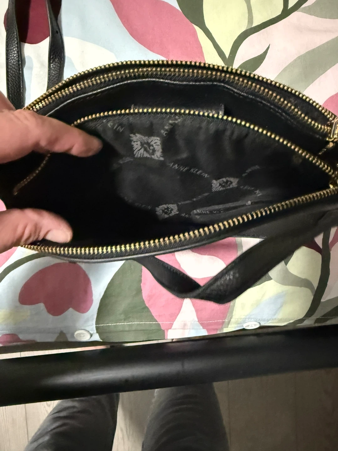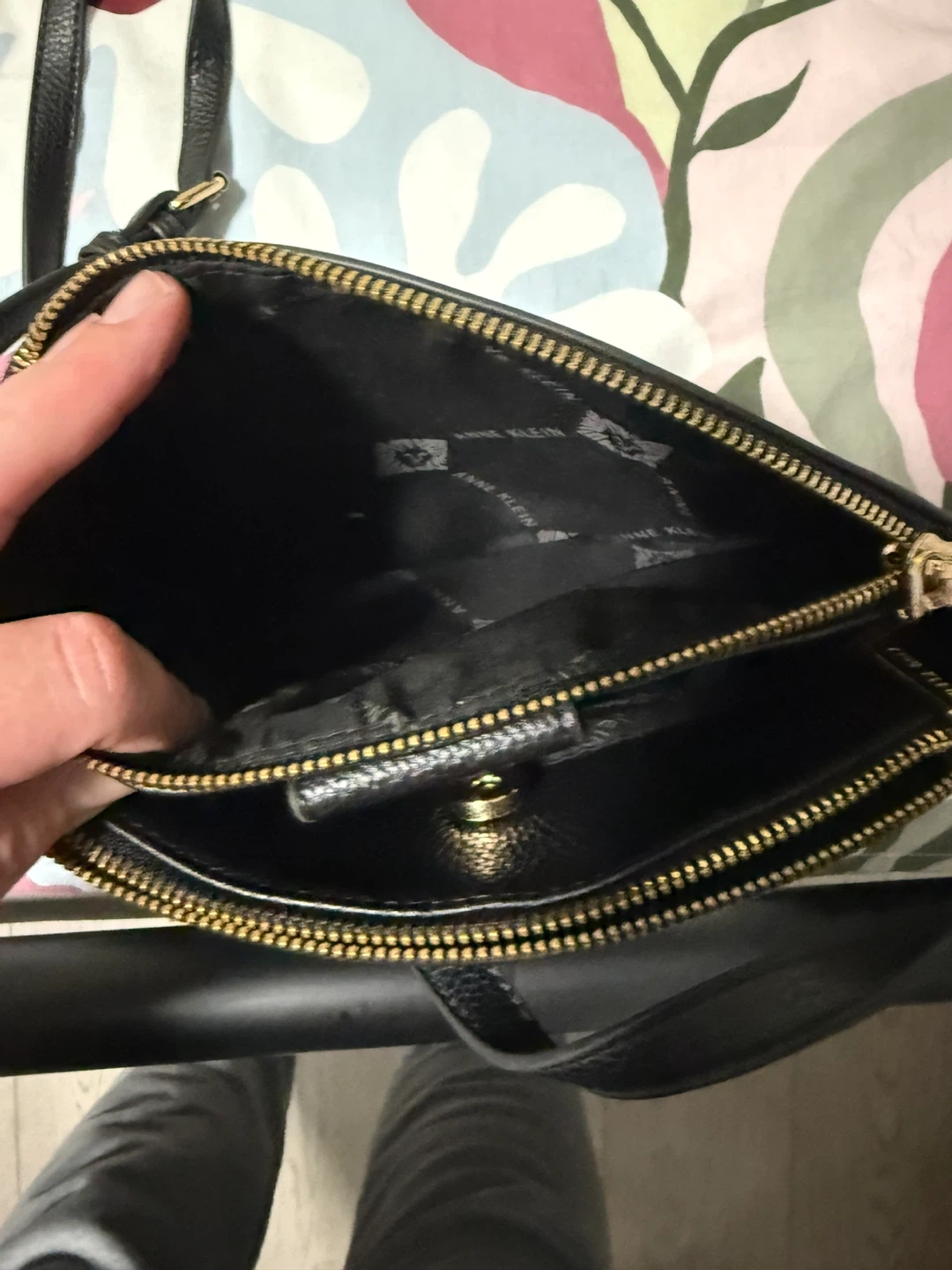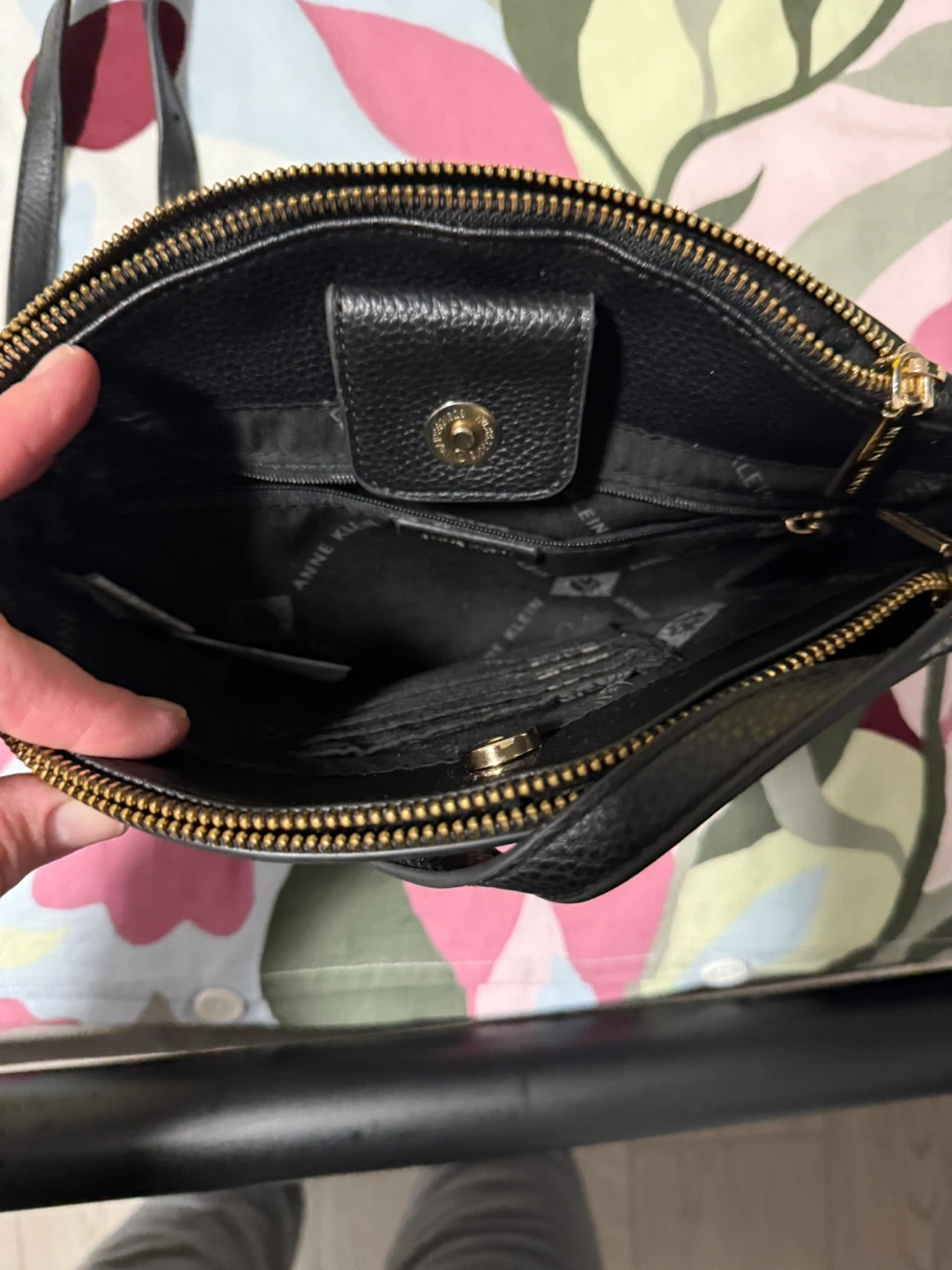 Selling a cute Anne Klein crossbody bag in black! It's in great condition and perfect for everyday use. The bag features a zipper closure and a long strap for comfortable carrying. It's a stylish and practical accessory to complete your outfit slight wear on the bottom right