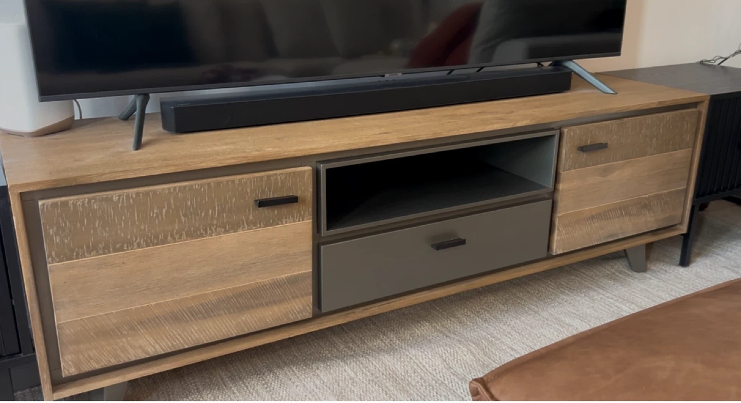 Selling a lovely wooden TV stand with drawers. It's perfect for organizing your living room and adding a touch of warmth to your space. It’s like new, I’m selling it because I’m moving.