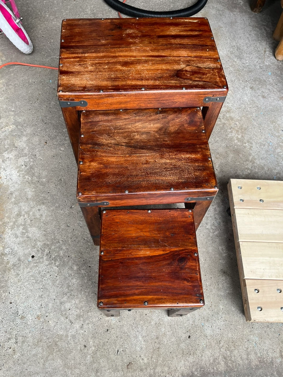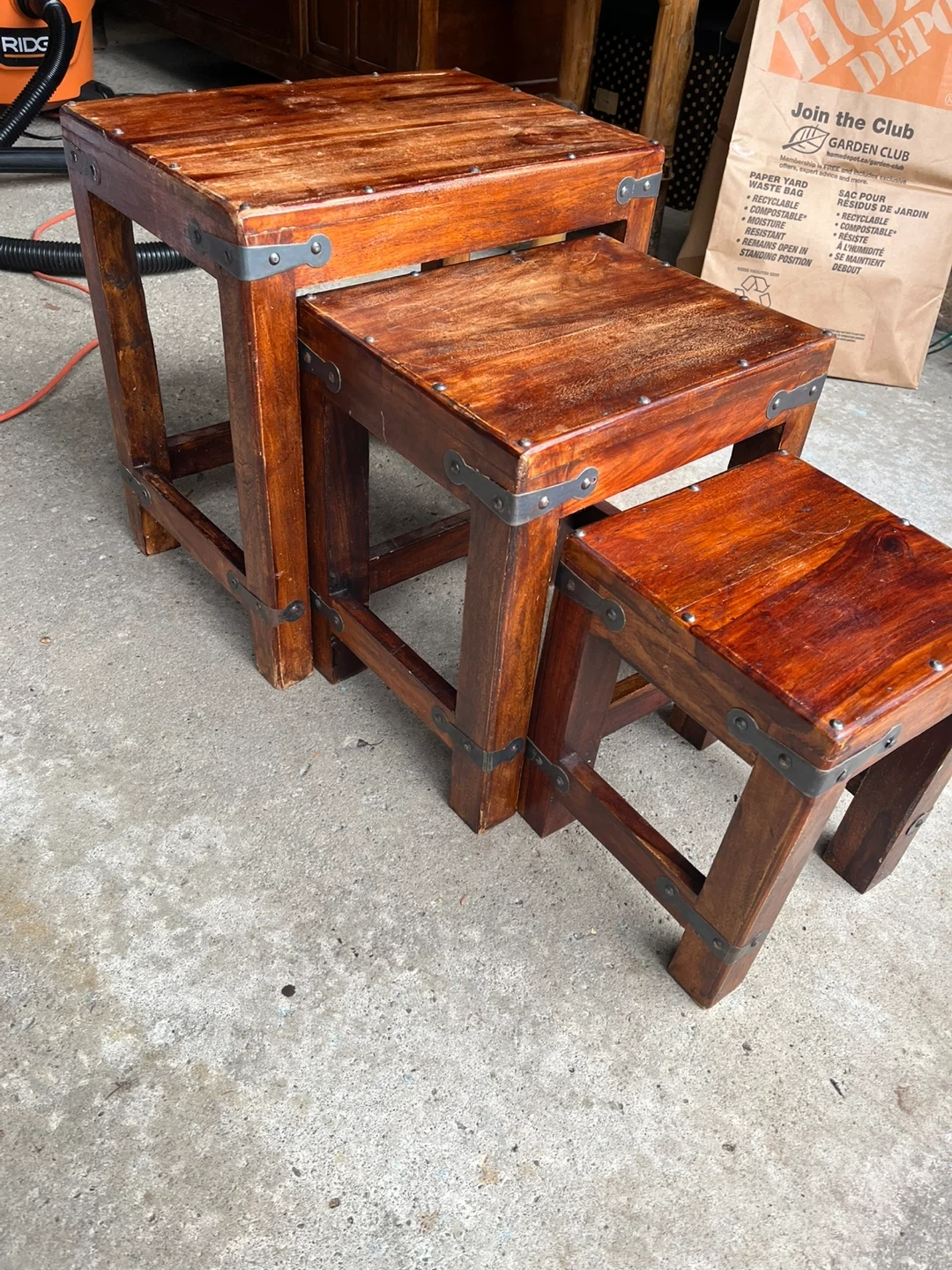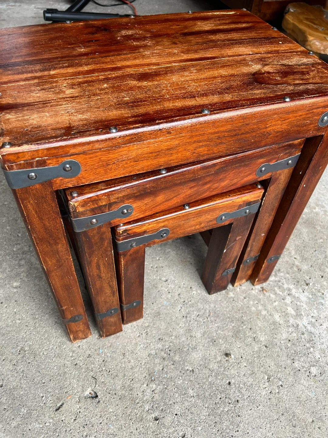 Selling a set of three wooden nesting tables. The largest table measures approximately 18 inches by 12 inches. They are in good condition and would be a great addition to any living room or bedroom!
