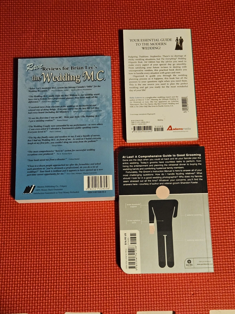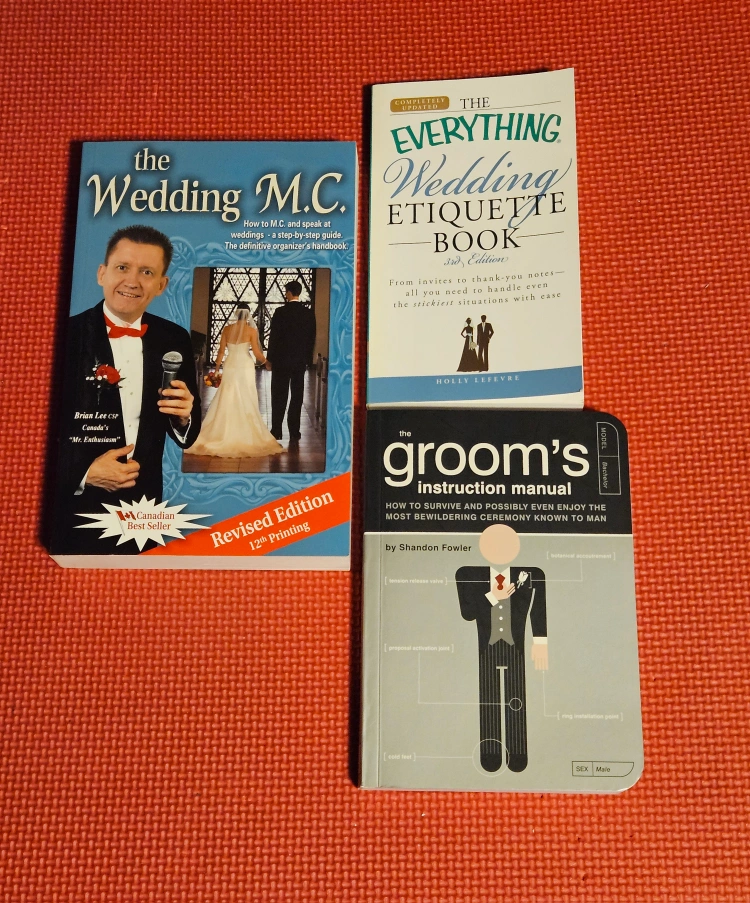 All for $3. Like new, used condition - The Wedding M.C. by Brian Lee - The Everything Wedding Etiquette Book by Holly Lefevre - The Groom's Instruction Manual by Shawndon Fowler