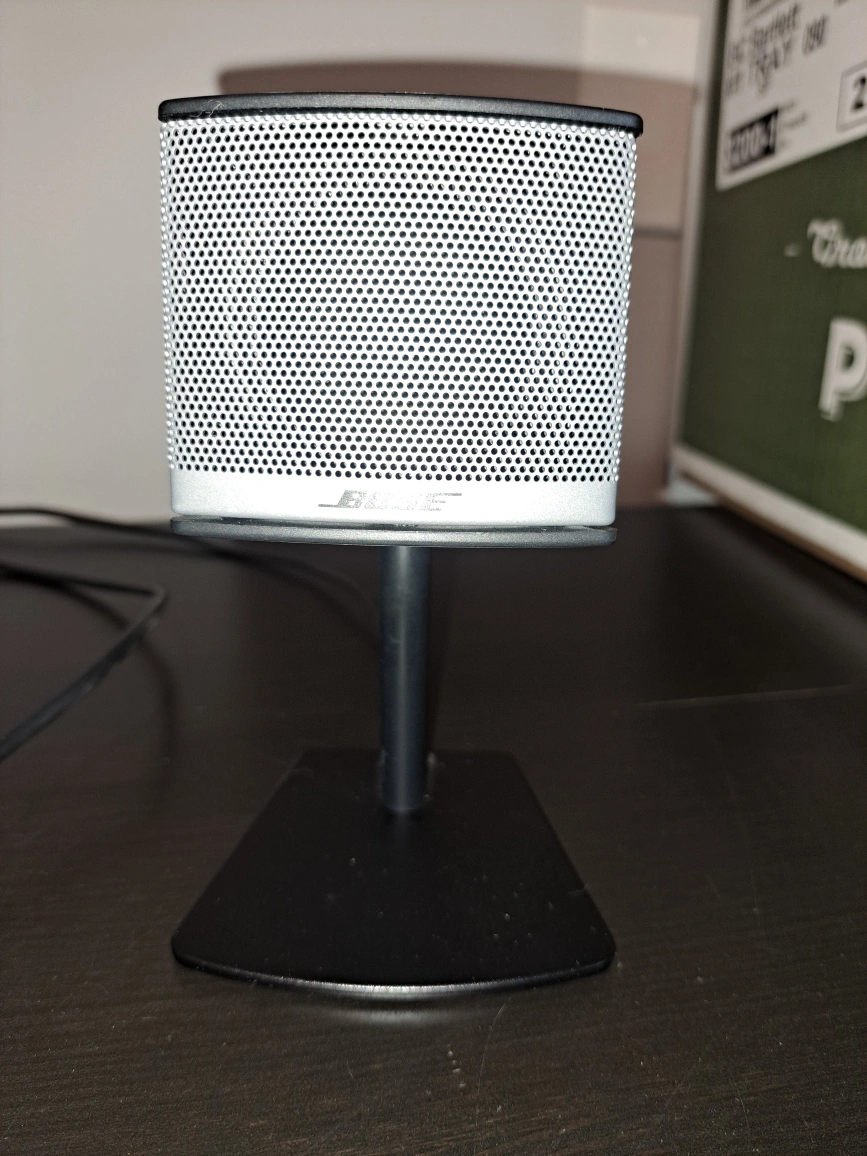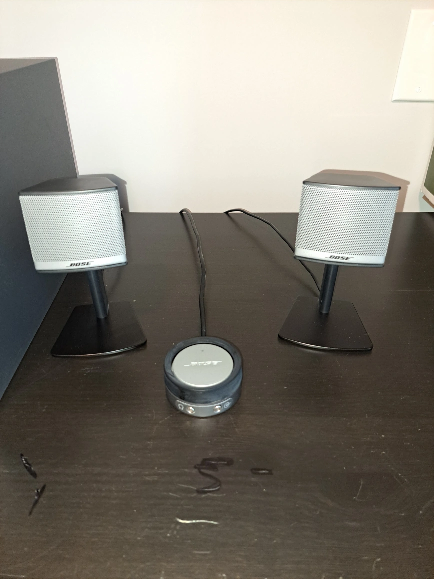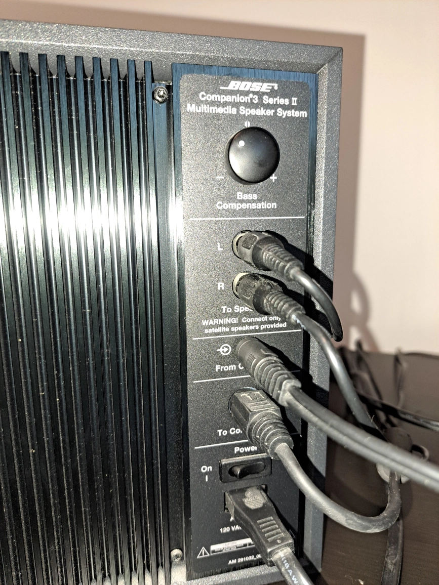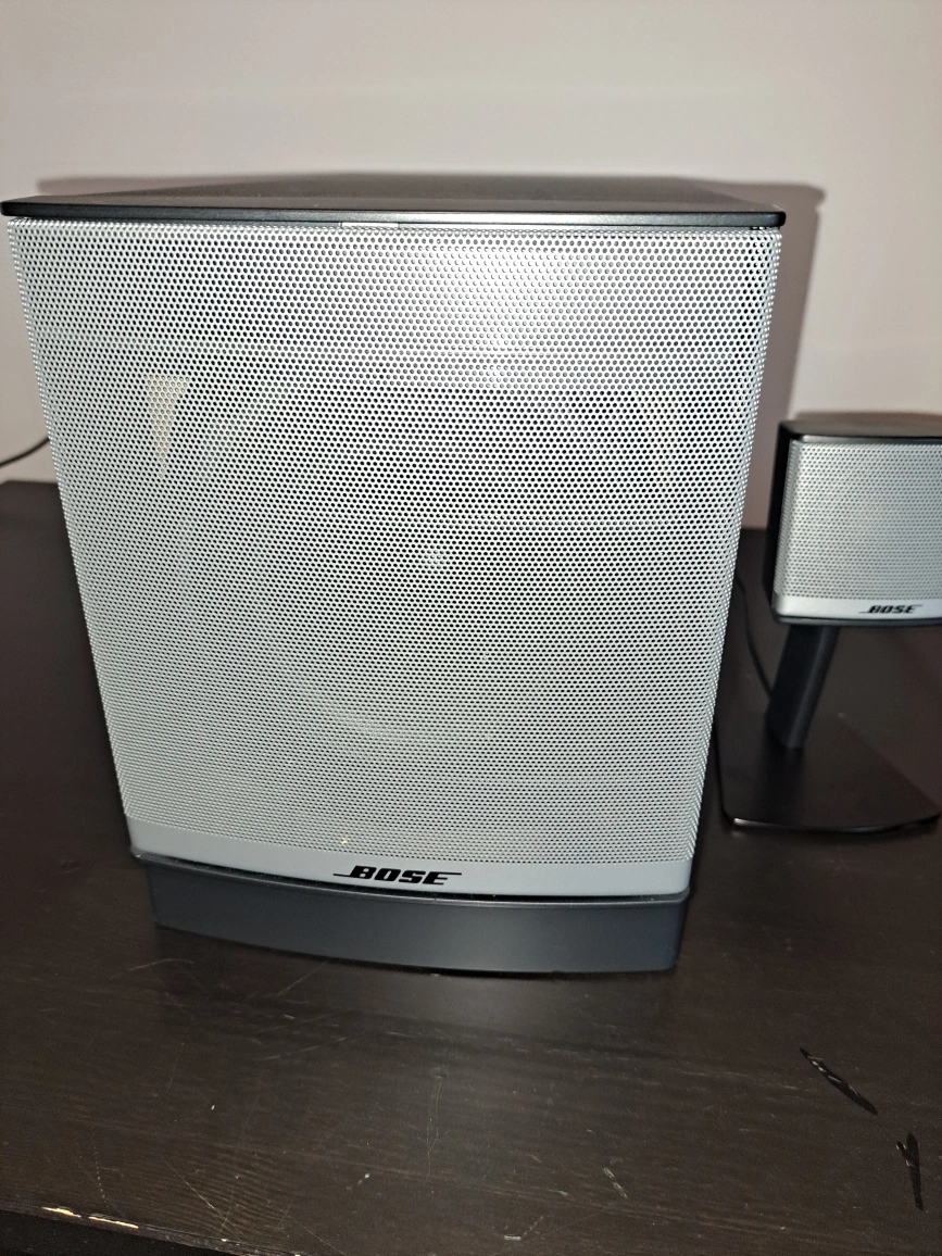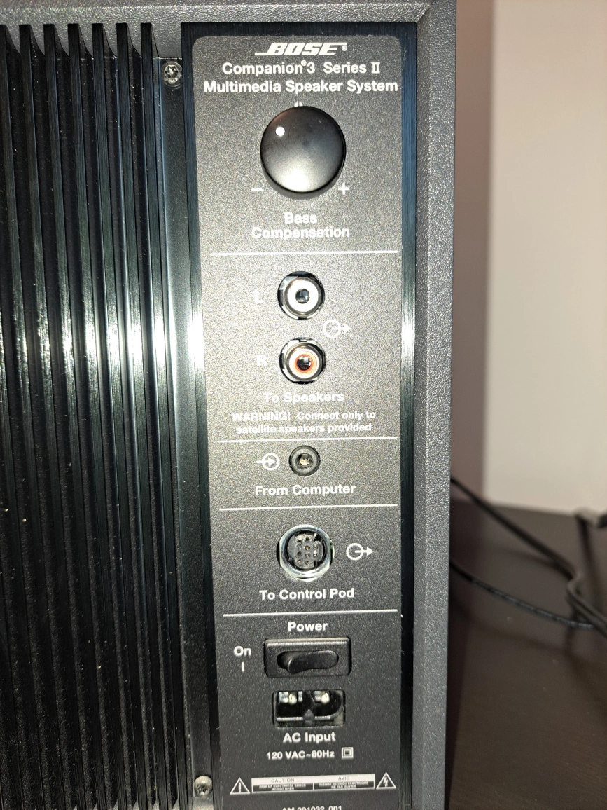 Selling a Bose Companion 3 Series II multimedia speaker system. It comes with the subwoofer, two satellite speakers, and the control pod. Great for your computer or any audio setup! Bose Companion 3 Series II Multimedia Speaker System. This is a 2.1 channel speaker system designed for computer audio, featuring two satellite speakers and an Acoustimass module (subwoofer). It includes a wired control pod for volume, headphone jack, auxiliary input, and mute function. The system utilizes Bose's TrueSpace™ signal processing circuitry to create a wide soundstage. It connects to your computer via a dedicated input and requires AC power (120 VAC-60Hz). The system is designed to be used only with the provided satellite speakers, as indicated by a warning on the back panel. non smoking home cash only