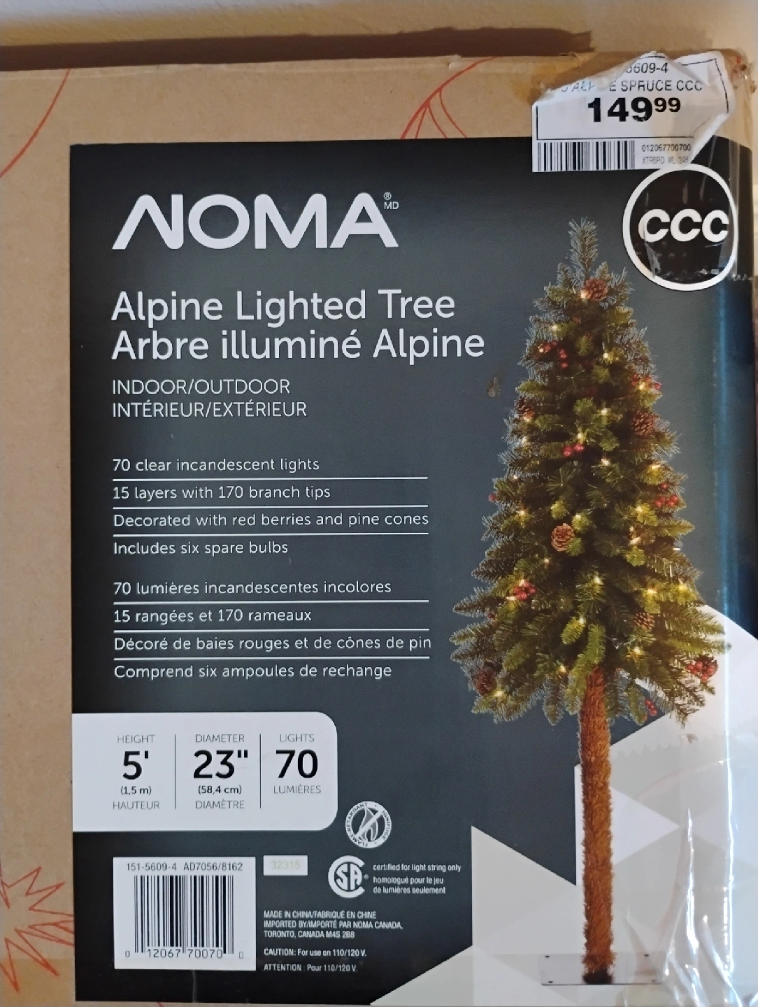 Get ready for the holidays with this NOMA Alpine Lighted Tree! It's 5 feet tall and comes with 70 clear incandescent lights. The tree is decorated with red berries and pine cones, and includes 6 spare bulbs. It features 15 layers with 170 branch tips. Originally bought for $149.99