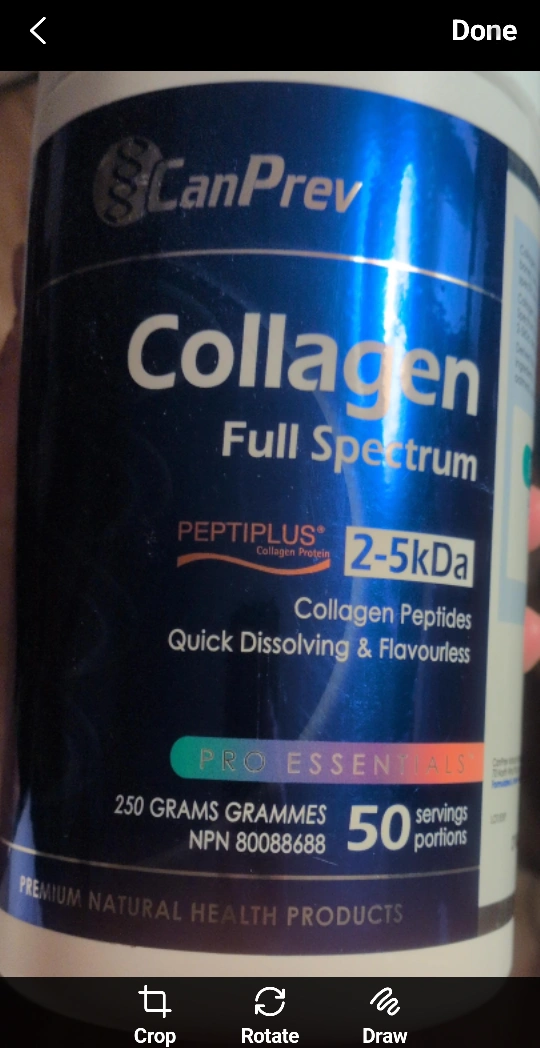 Selling a container of CanPrev Collagen Full Spectrum. It contains collagen peptides that are quick dissolving and flavourless. It comes in a 250 gram container with 50 servings. It's part of the Pro Essentials line and is a premium natural health product