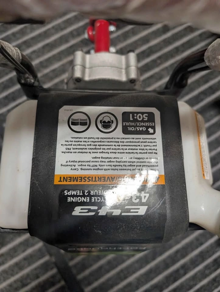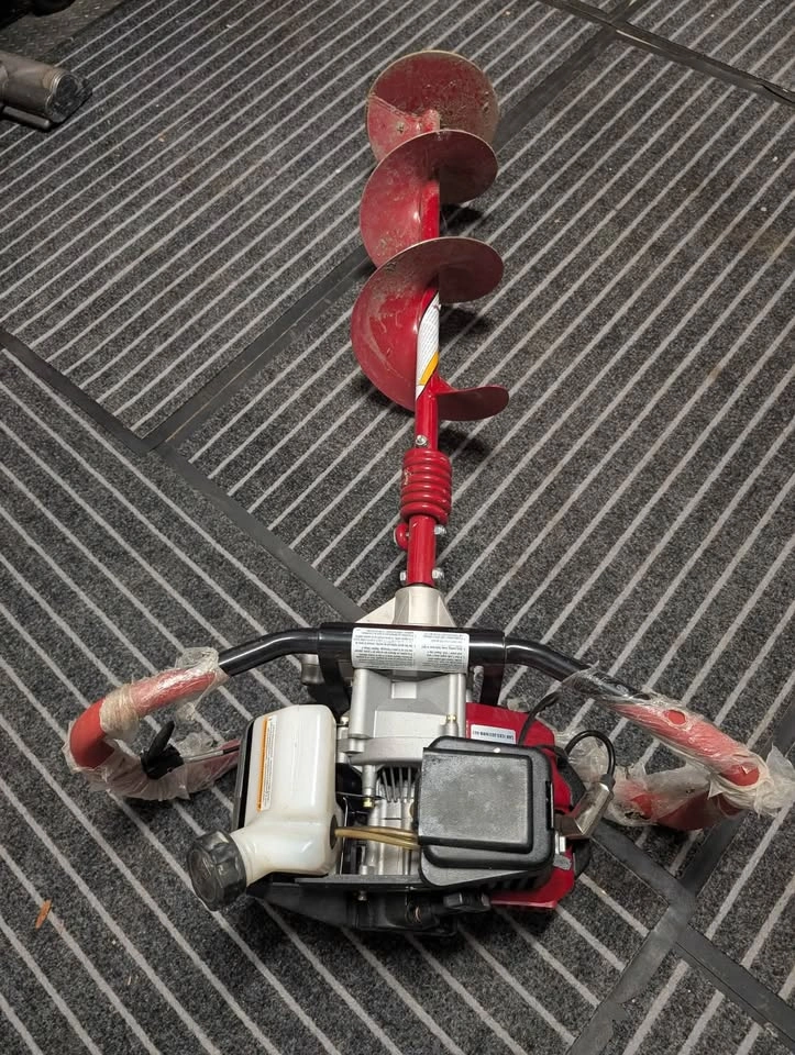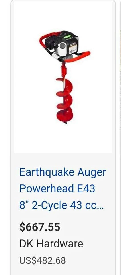Brand new condition, with low hours on it. Earthquake E43 1-Person Earth Auger Powerhead with an 8-inch Earth Auger Bit. Robust, efficient performance is what you can expect from the Earthquake 43cc earth auger powerhead. The Viper 2-cycle 43cc, 2 HP engine makes 1.6 ft. - lb. of engine torque (45.5 ft. - lb. output shaft torque), enabling you to dig post holes. It has anti-vibration foam grip handles to reduce fatigue. It works with Earthquake augers from 2 - 10 in. in diameter for versatility. This combo comes with EA8F 8 ft. Earthquake earth auger.