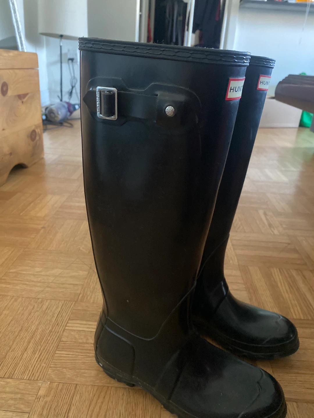 Selling a pair of Hunter rain boots in black, size 8. They are in good condition and perfect for rainy days! These boots are great for keeping your feet dry and stylish. They are made of durable rubber material.