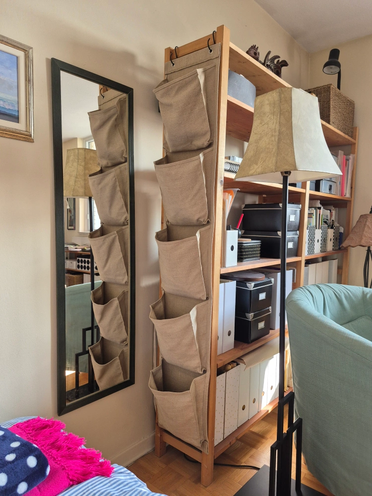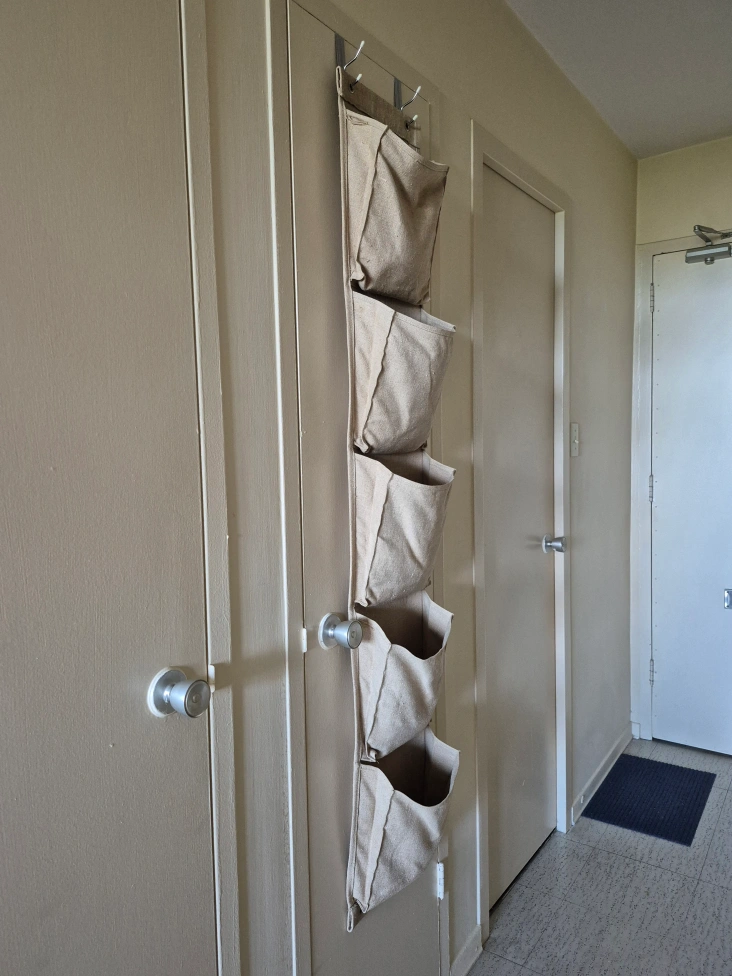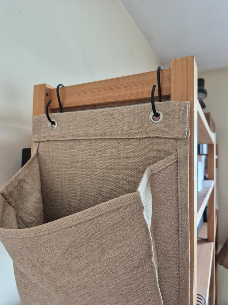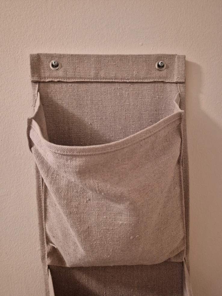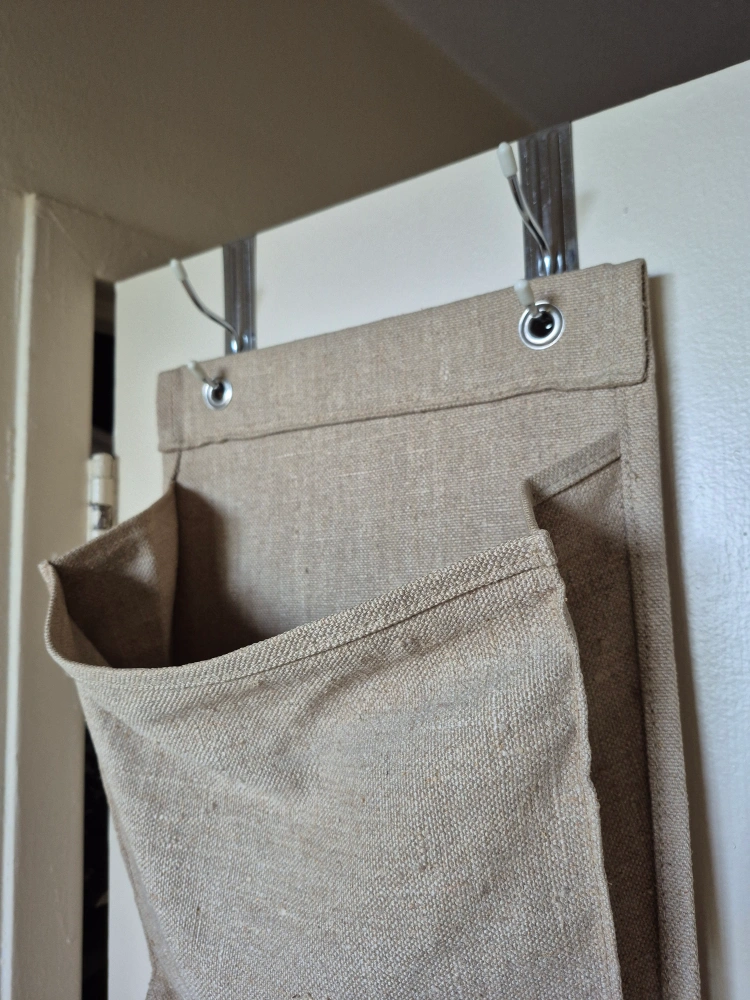 Outstanding quality. Made in Denmark. Useful storage that's versatile and easily portable. Many uses and ways to hang (π· See all 10 photos). Very handy on a closet door (for socks, underwear), at an entrance (for hats, scarves, mittens, re-usable bags) or in a bedroom for soft toys! β Thick, strong and sturdy, made of natural fibres, not nylon (this is NOT Ikea made in China). β 5 large pockets π 62.25" long in all and 11" wide Has 2 solidly reinforced grommet holes at top so you can hang this in a variety of ways: β on 2 over-the-door hooks (not included), β on S-hooks on the side of a bookcase (shown on Ikea Ivar), β or affixed to the wall with 2 screws. I can include 2 screws for you that are the perfect length, and have a smooth part near the end on which the grommet hole rests. Photos π· show these 3 examples. There are also 2 grommet holes at bottom to further secure it (though I've never found this necessary). This piece is very well made. I've had it for years and it's still in superb condition (do they even still make things this well?) βοΈ From a smoke-free, scent-free, pet-free and pest-free home.