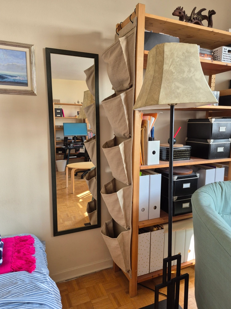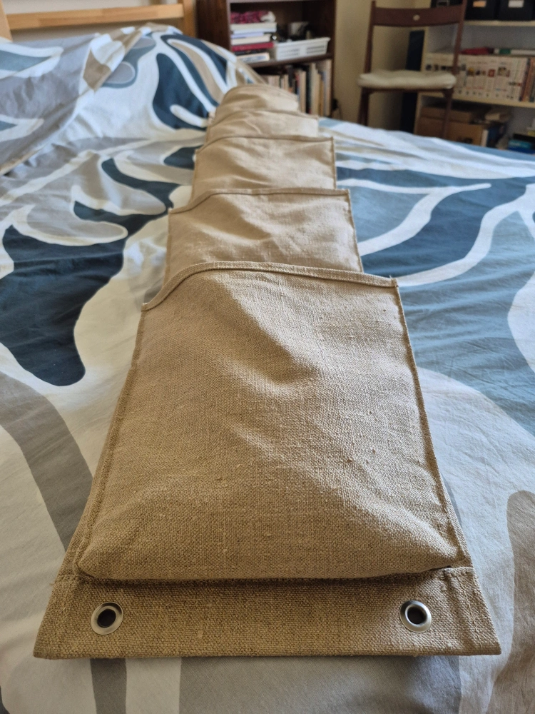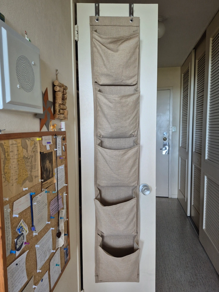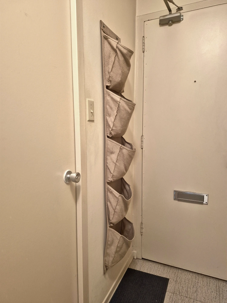 Outstanding quality. Made in Denmark. Useful storage that's versatile and easily portable. Many uses and ways to hang (π· See all 10 photos). Very handy on a closet door (for socks, underwear), at an entrance (for hats, scarves, mittens, re-usable bags) or in a bedroom for soft toys! β Thick, strong and sturdy, made of natural fibres, not nylon (this is NOT Ikea made in China). β 5 large pockets π 62.25" long in all and 11" wide Has 2 solidly reinforced grommet holes at top so you can hang this in a variety of ways: β on 2 over-the-door hooks (not included), β on S-hooks on the side of a bookcase (shown on Ikea Ivar), β or affixed to the wall with 2 screws. I can include 2 screws for you that are the perfect length, and have a smooth part near the end on which the grommet hole rests. Photos π· show these 3 examples. There are also 2 grommet holes at bottom to further secure it (though I've never found this necessary). This piece is very well made. I've had it for years and it's still in superb condition (do they even still make things this well?) βοΈ From a smoke-free, scent-free, pet-free and pest-free home.