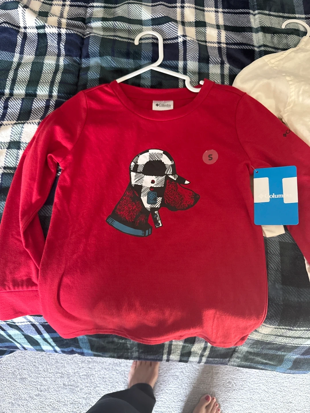 Here's a cute red long sleeve shirt from Columbia for kids. It's a size small and features a fun graphic. Perfect for keeping your little one warm and stylish!