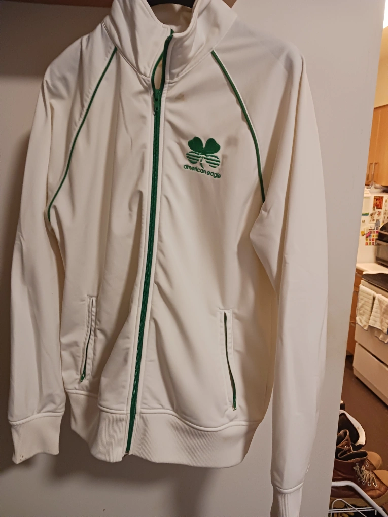 Selling an American Eagle track jacket! It's white with green accents that make it pop and a zipper. It says XS but I'm 6" and wore it when I was 160 lbs..
