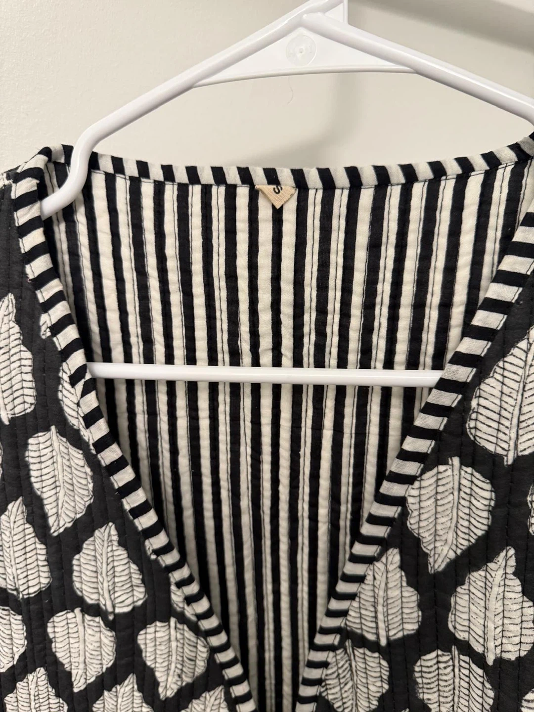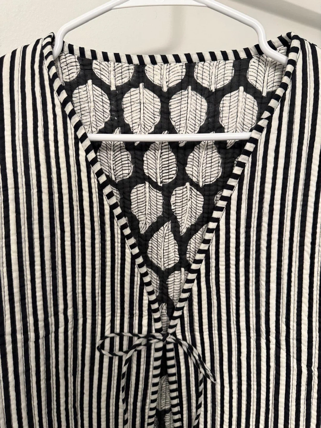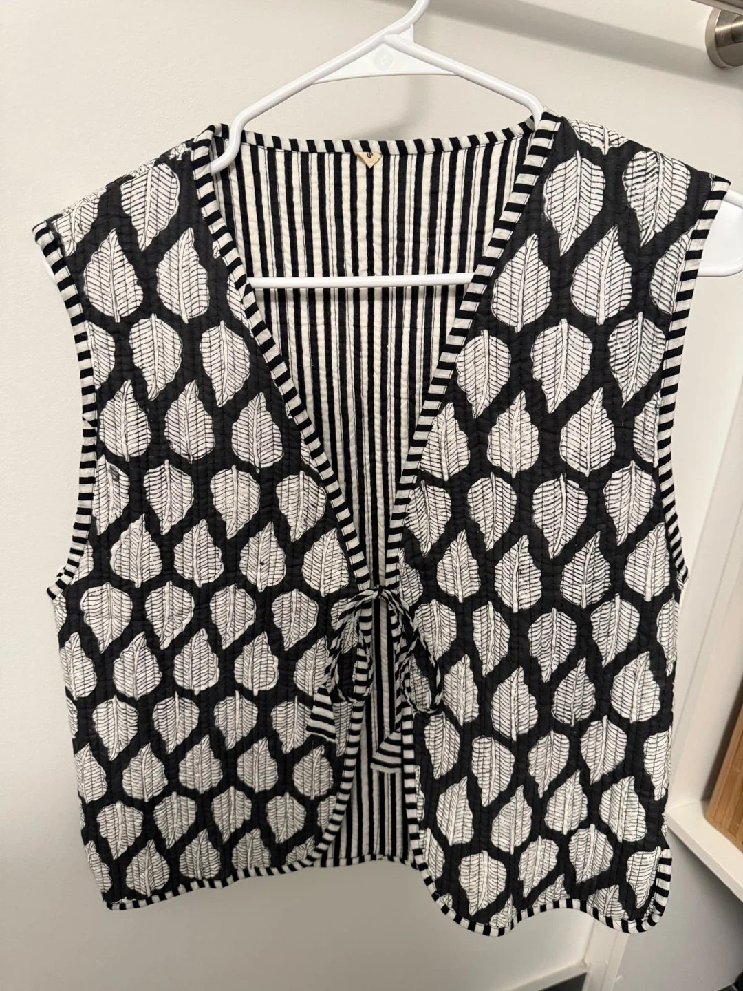Here's a cute black and white 2 in 1 vest with a striped and leaf pattern! It's a size small and in great condition. Perfect for layering or adding a unique touch to your outfit. It’s a size small but loose fit. Material- Pure cotton
