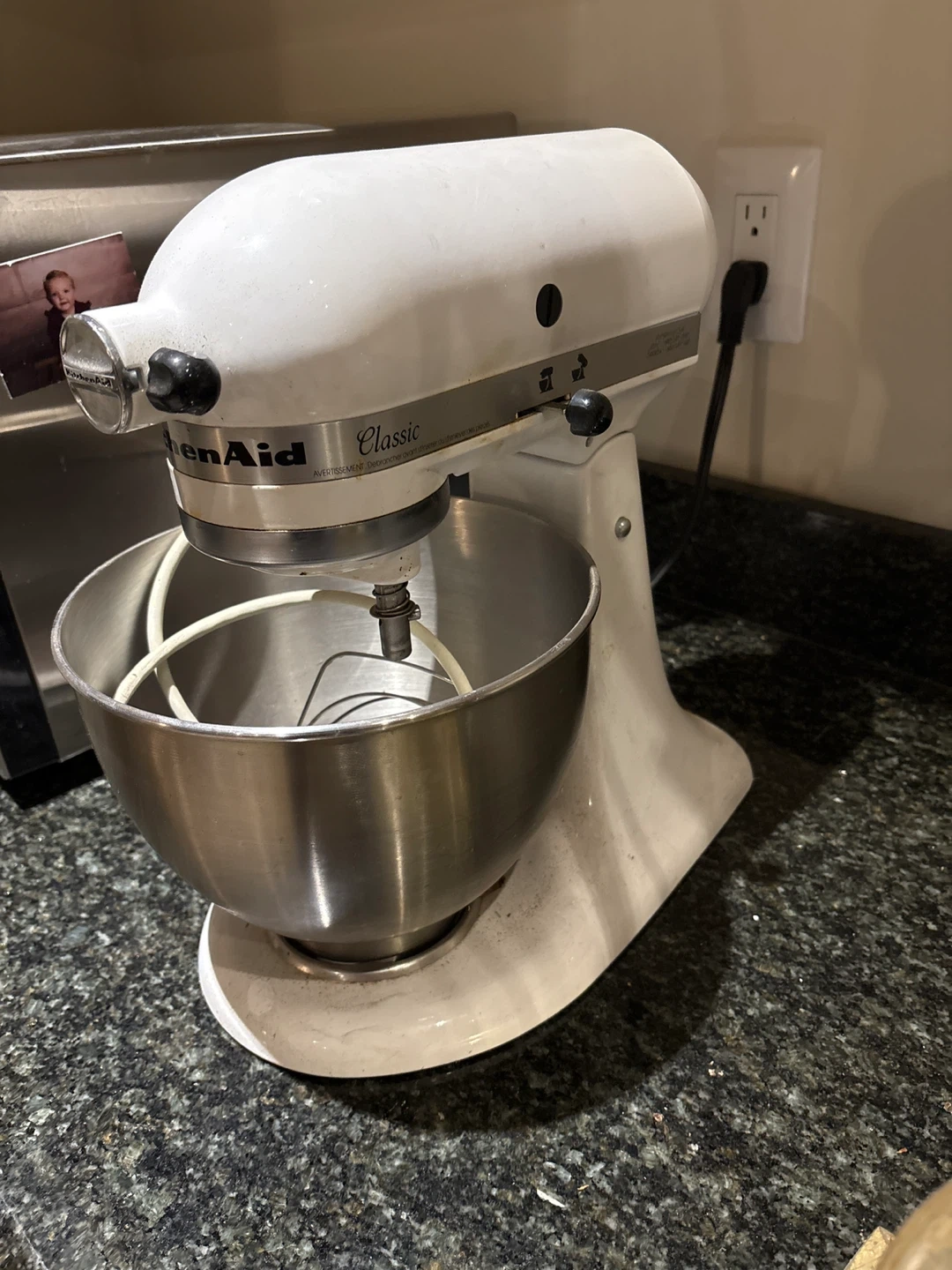 Selling a KitchenAid Classic stand mixer. It has a stainless steel bowl and comes with the attachments pictured. It's a great addition to any kitchen for baking needs!