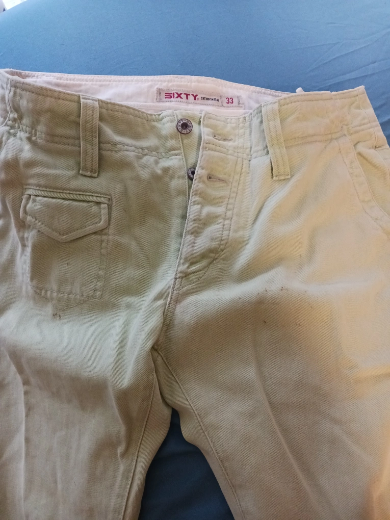 Here are some Sixty pants in a light green colour. They are in good condition, Ihad them altered from bell bottoms to slim fit. They are heavy-duty denim and so much fun to wear! They are ready to move on to a new person to pleasure!