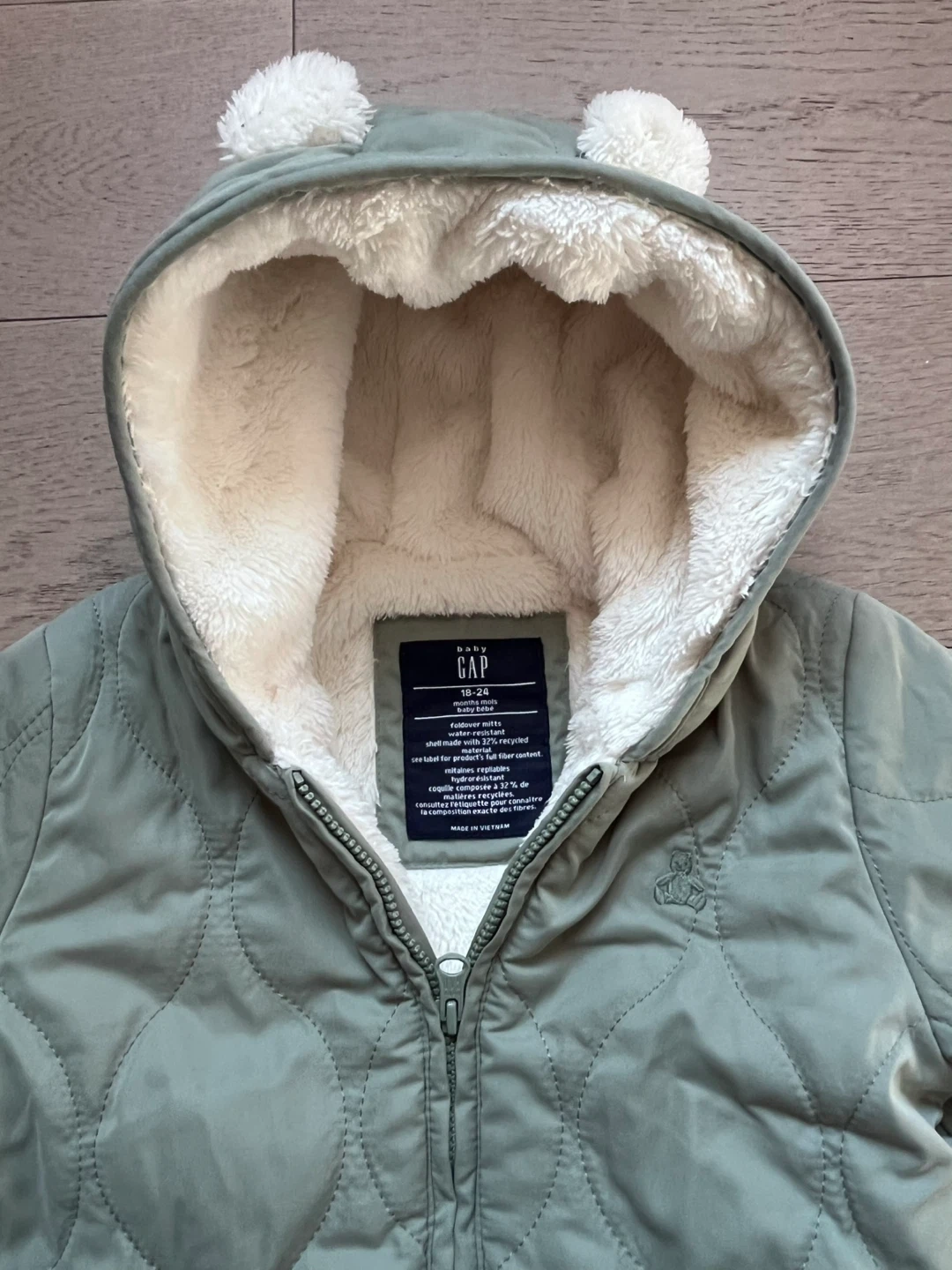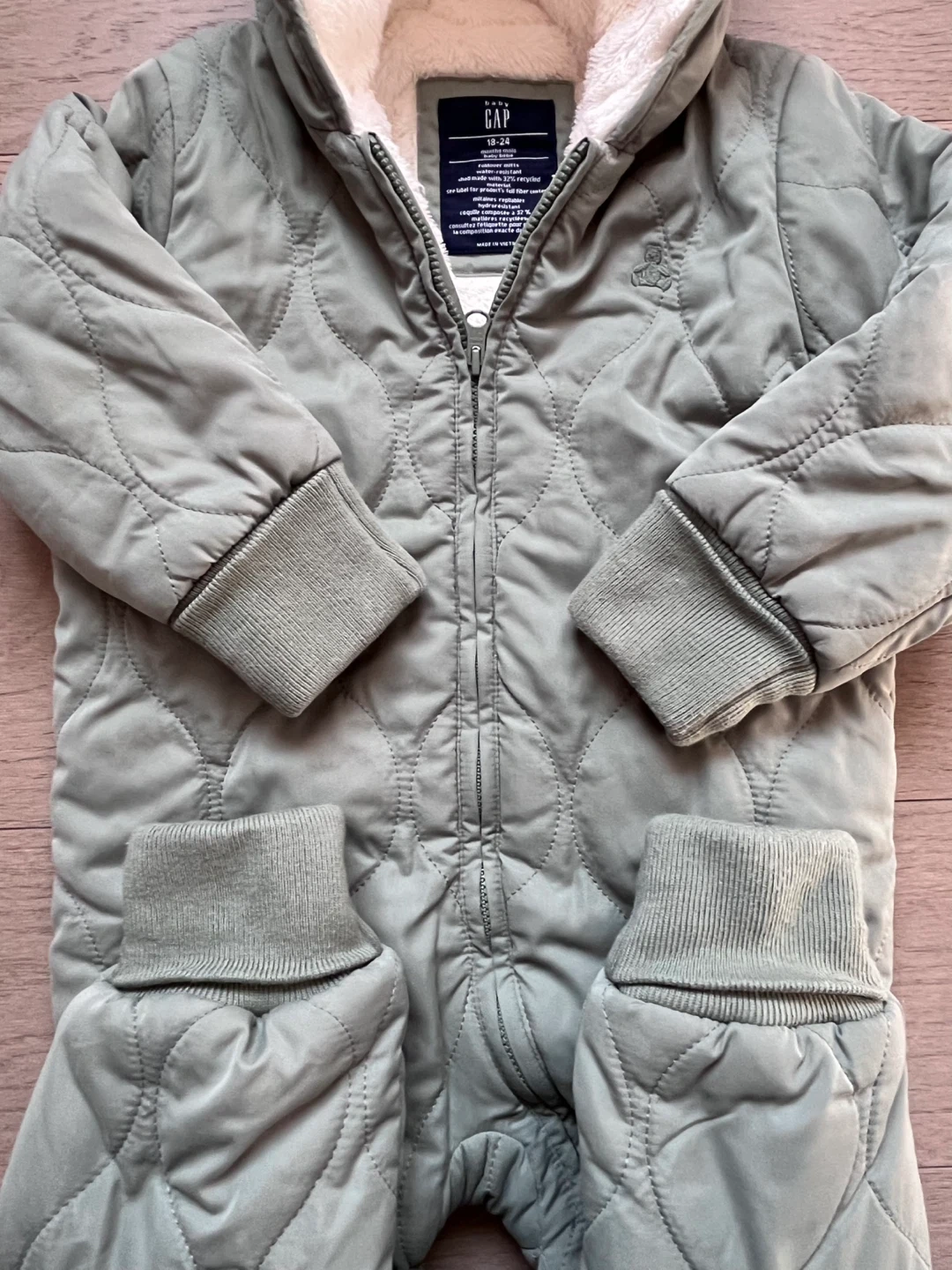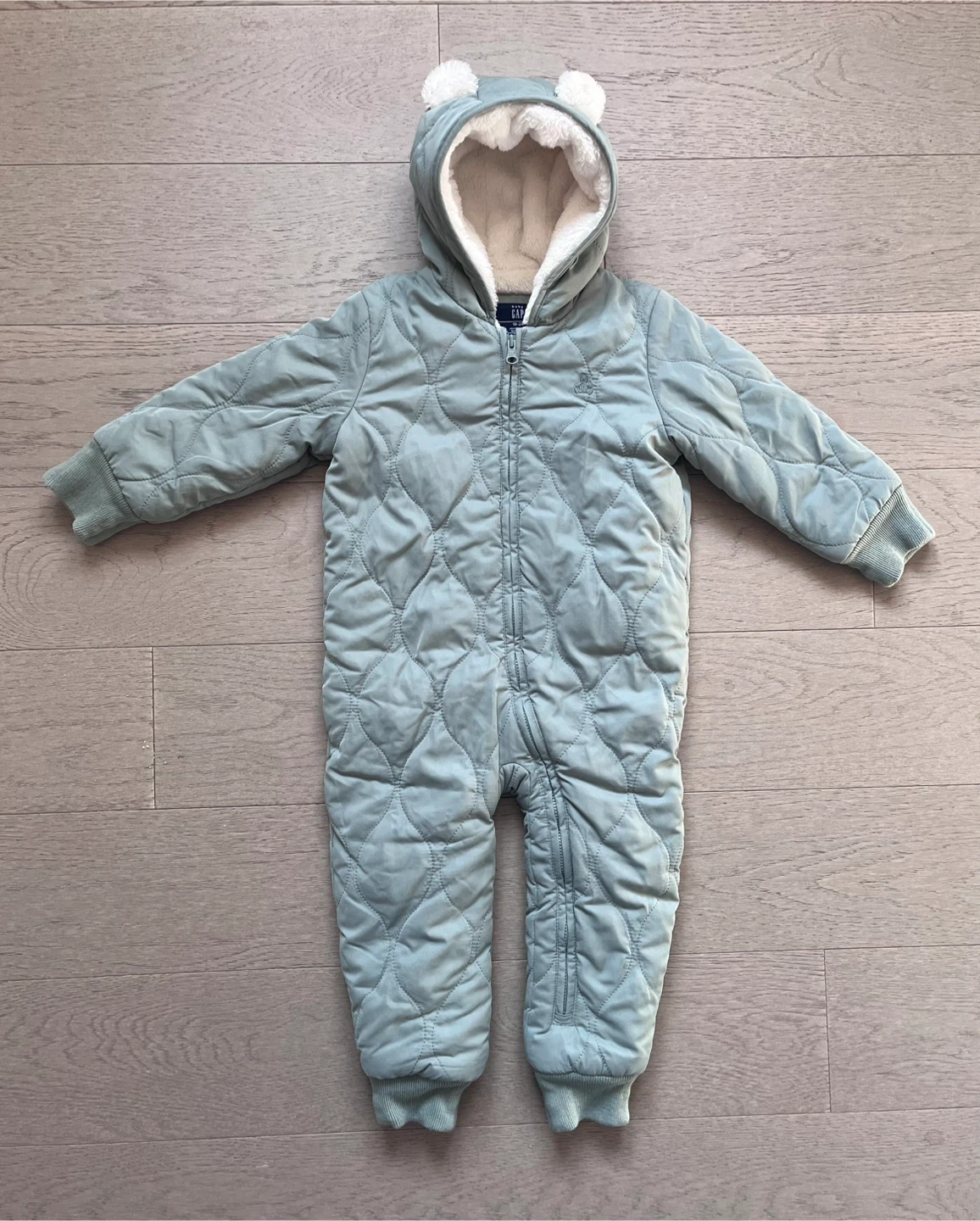 Super cozy suit for winter. Long sleeves with banded cuffs to keep little hands and feet warm without mittens or boots. Has been washed. * Soft knit with inner sherpa lining. * Hooded neckline with bear ear appliques. * Zipper-front closure. * Banded cuffs. * 68% Polyester, 32% Recycled Polyester. * Machine wash, delicate cycle.