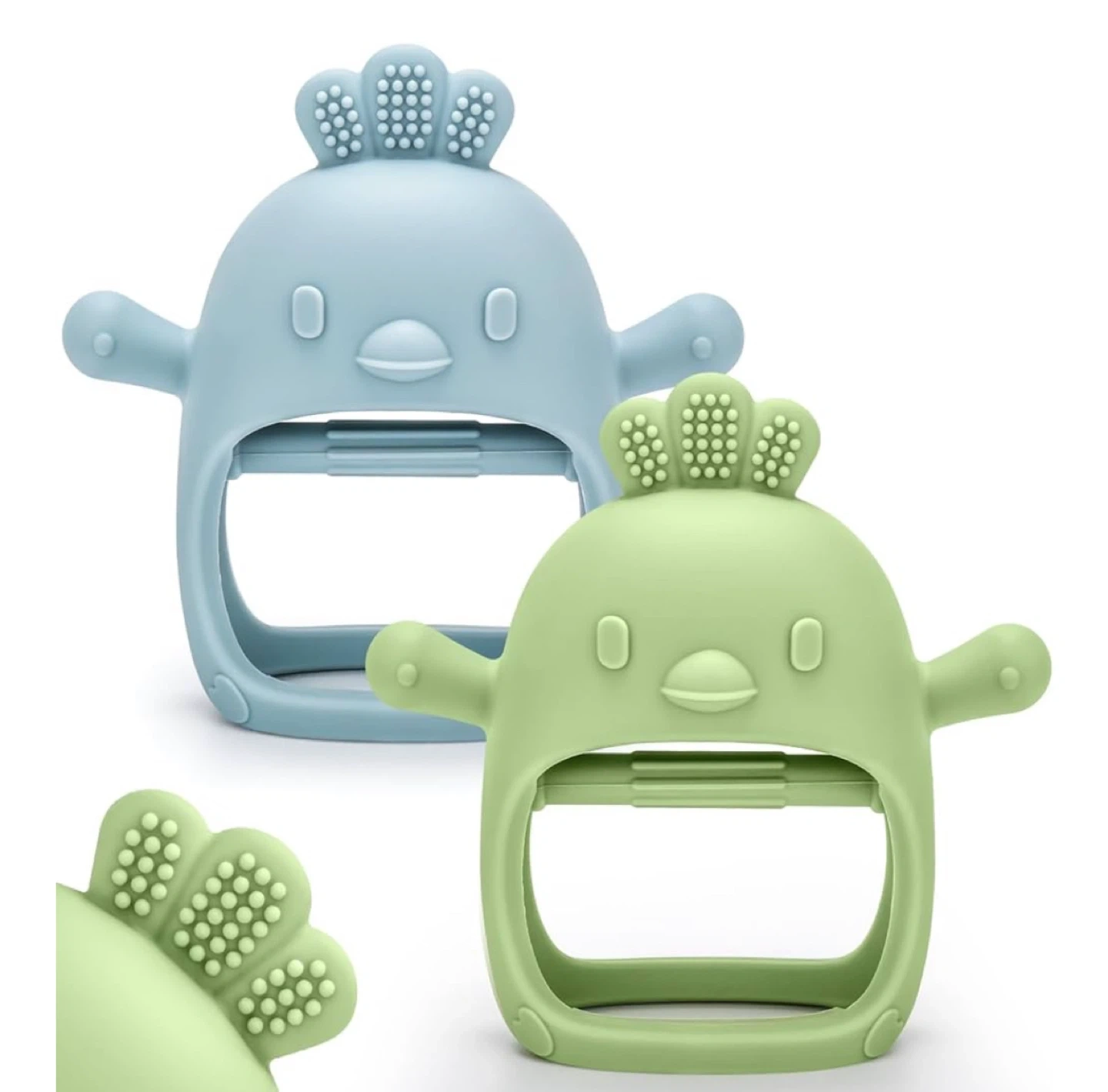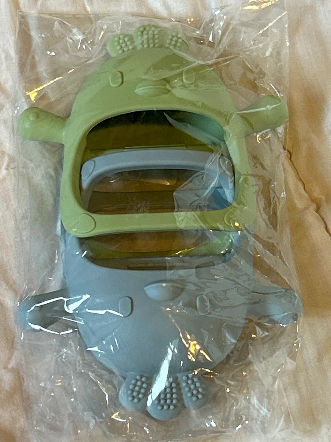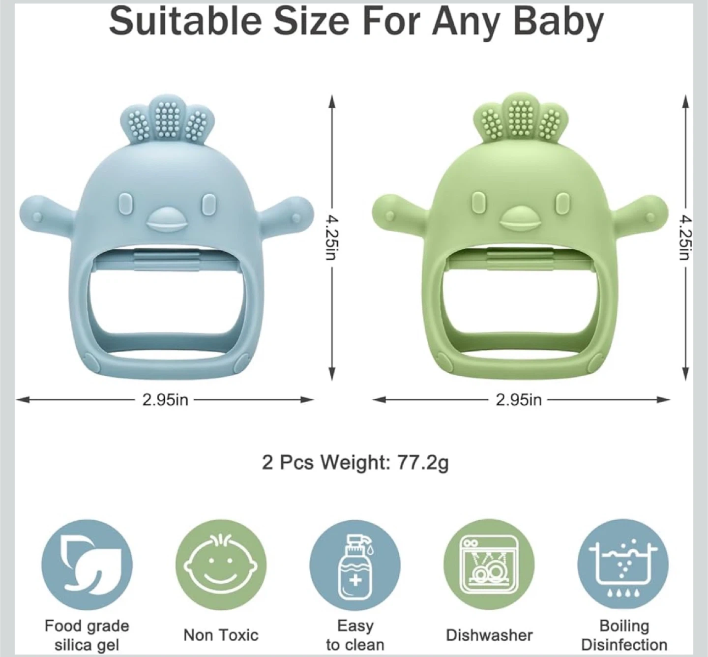 Selling a new set of baby teether toys! This set includes two teethers in blue and green. They are made of food grade silica gel, non-toxic, easy to clean, dishwasher safe, and suitable for boiling disinfection. The size is suitable for any baby. Each teether is 4.25 inches tall and 2.95 inches wide