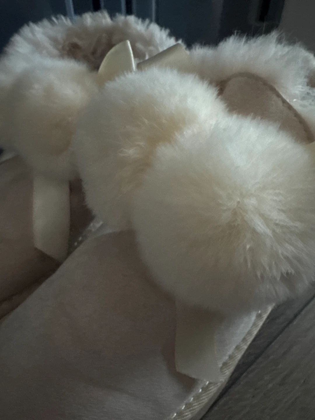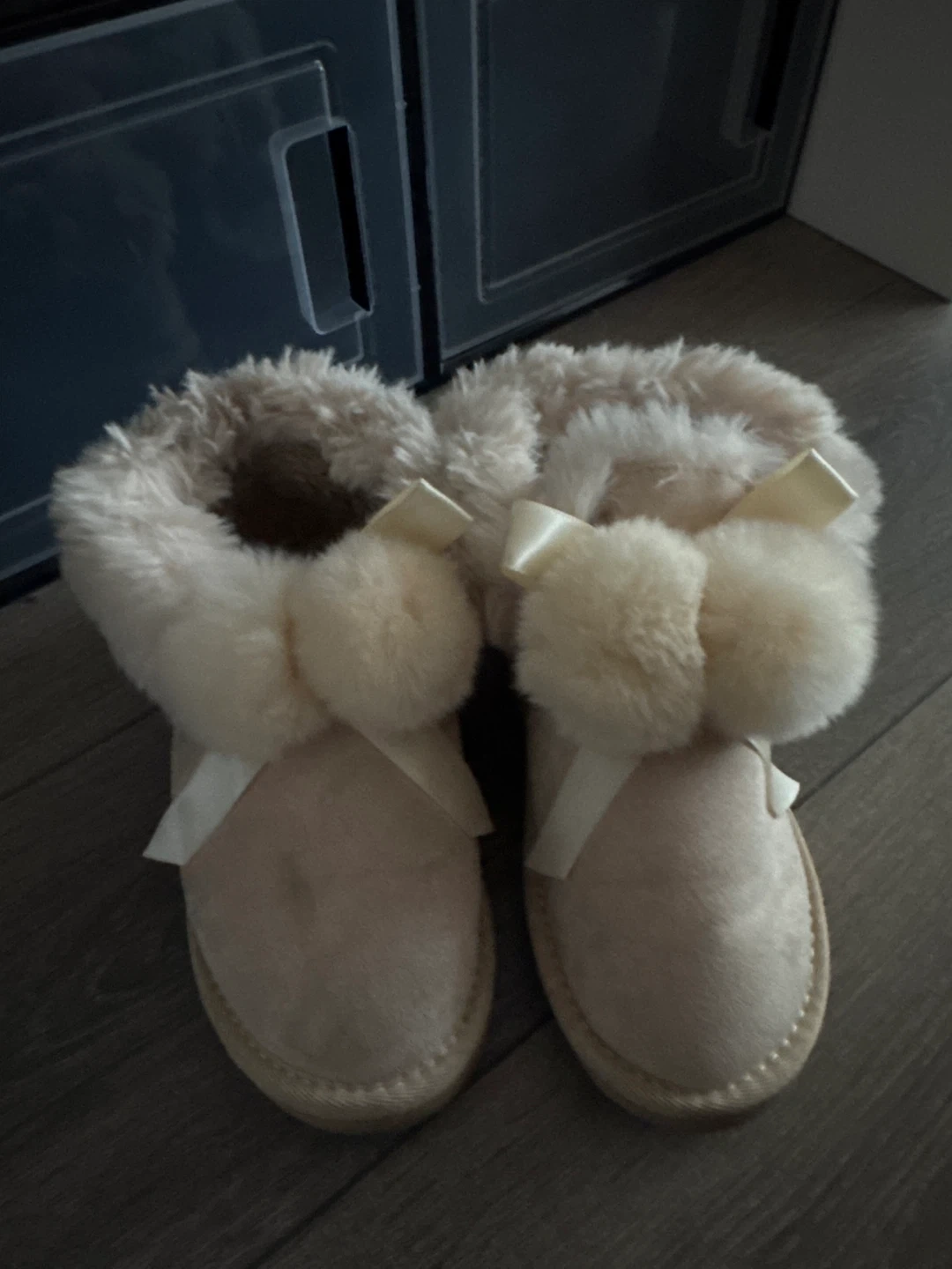 Selling a pair of cream-colored boots from Dude Shoes. They feature a fluffy trim and a cute ribbon detail. Perfect for keeping your feet cozy and stylish!