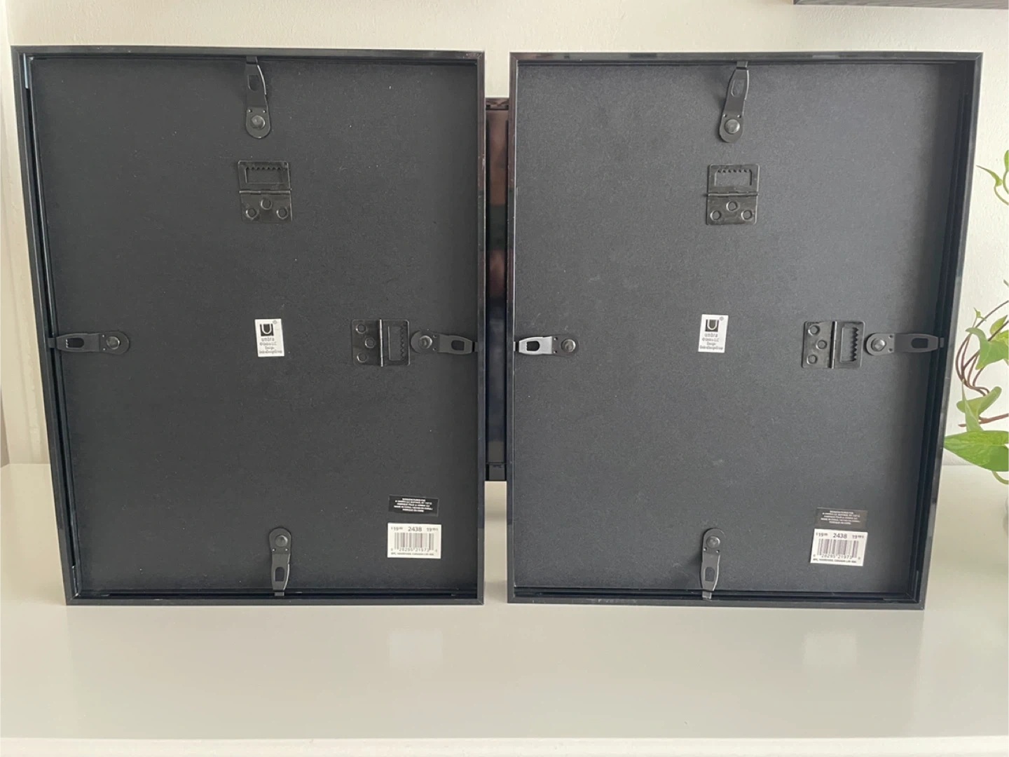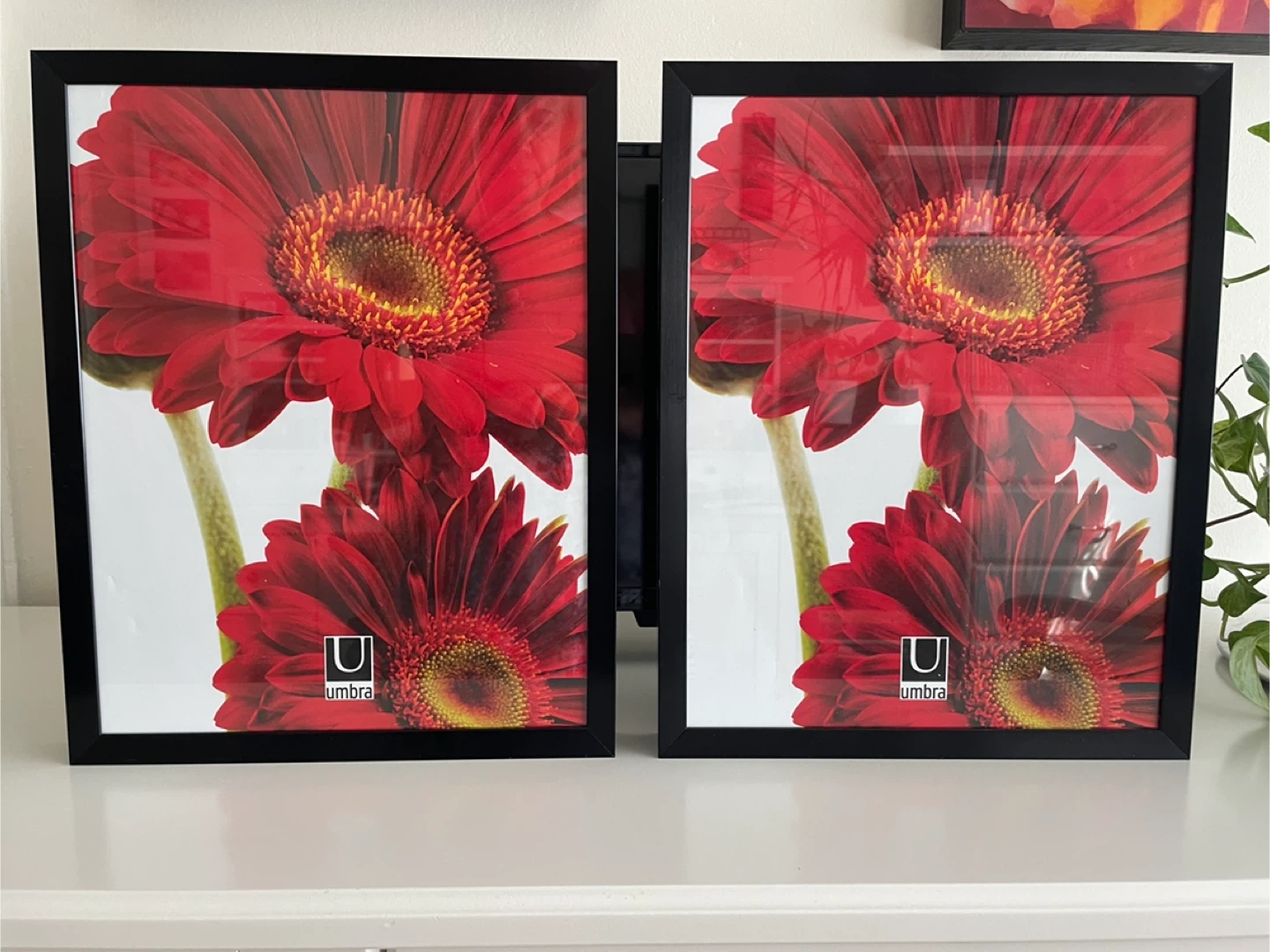 Selling a set of two Umbra black picture frames. The frames have a sleek, modern look that would complement any decor either you hang or stand them on flat surfaces.