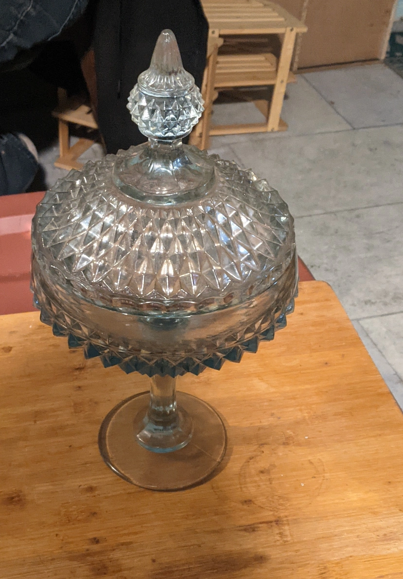 Selling a charming vintage Indiana glass candy dish with a lid. It has a beautiful, classic design that would look great in any home. Perfect for displaying candies, small treats, or as a decorative piece!