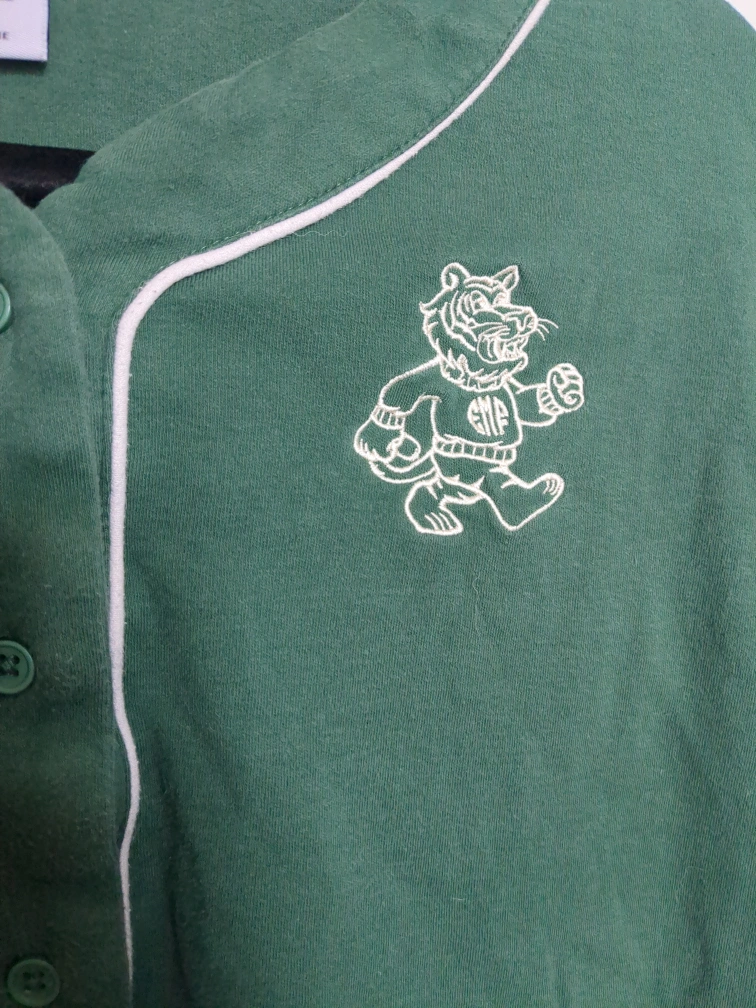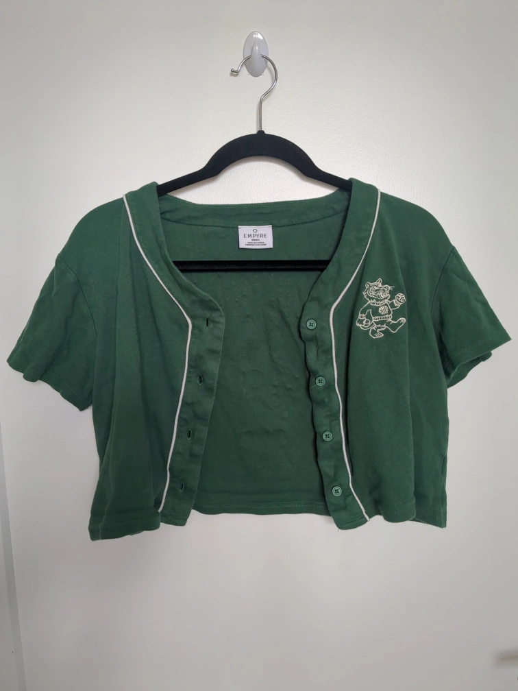 Cool barely worn baseball style Empyre crop top with green and white piping, an embroidered tiger on the chest, and varsity style design on the back! Size small, and worn maybe twice.