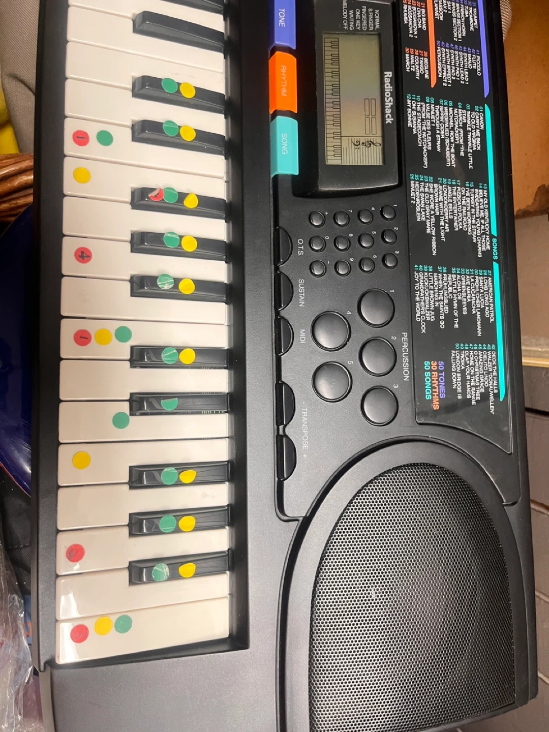Selling a RadioShack electronic keyboard! It has a variety of songs and tones, perfect for learning or just having fun. It has some colourful stickers on the keys.