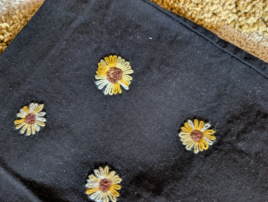 Pick up only. Clean canvas tote bag. DIY embroidered flowers. Signs of wear on handle. Lightweight.