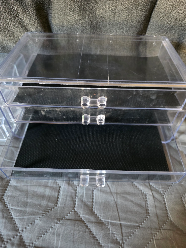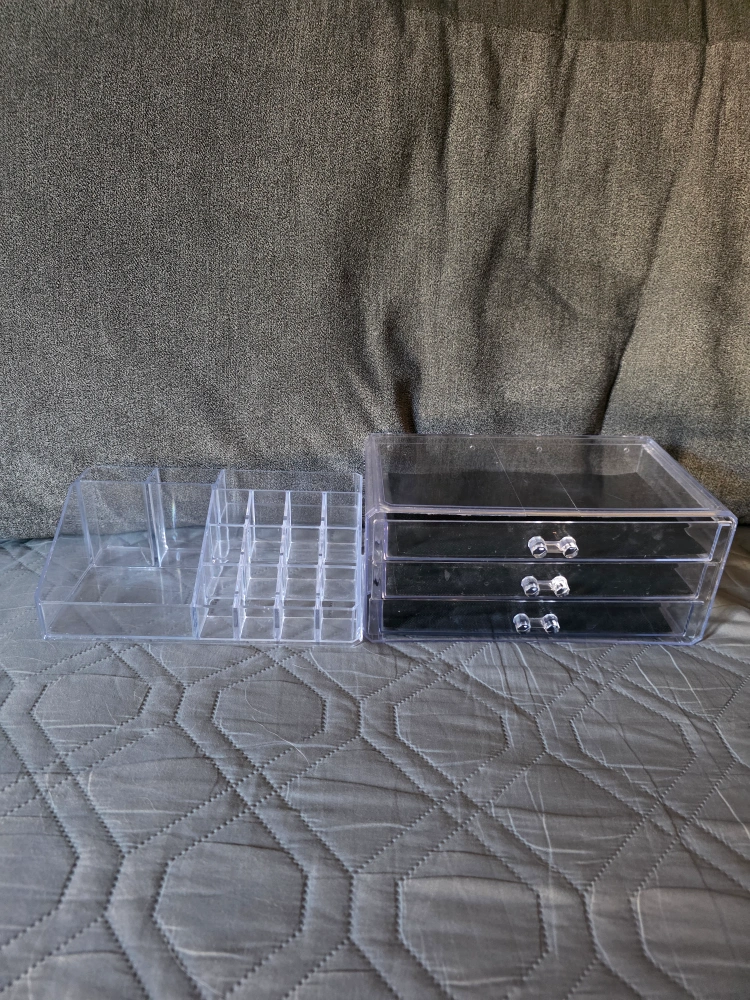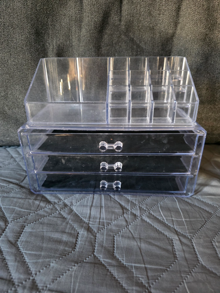 Plastic clear makeup organizer Can be used as is in the first picture or taken apart for two different areas Has three drawers Places for lots of items 9 and 1/2 in Long 5 and 1/2 in deep