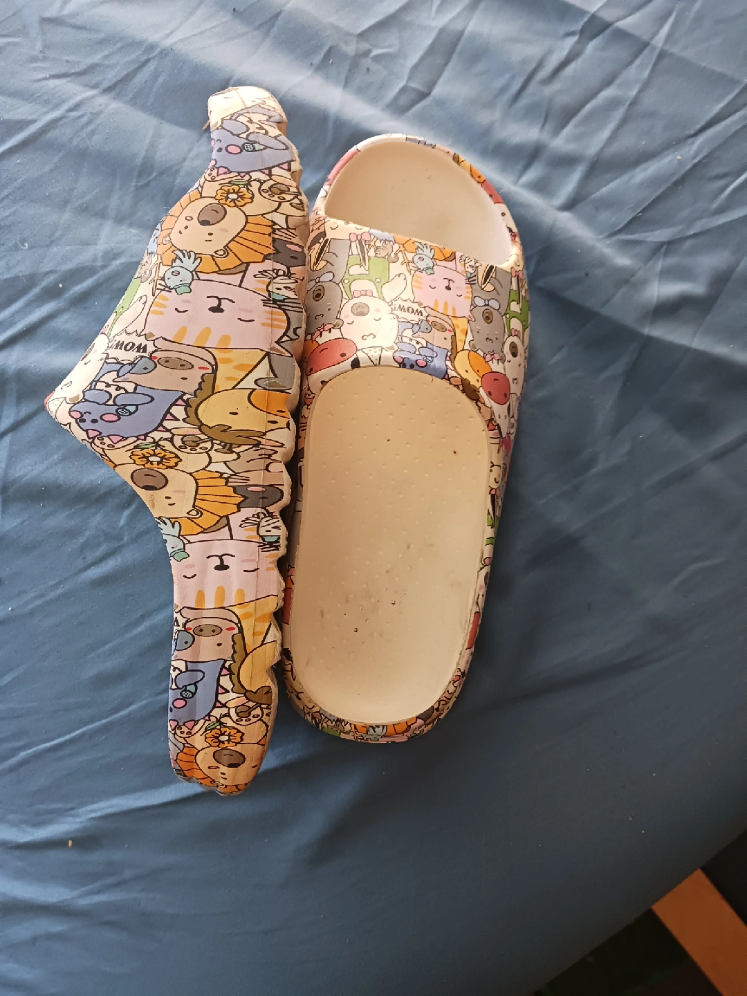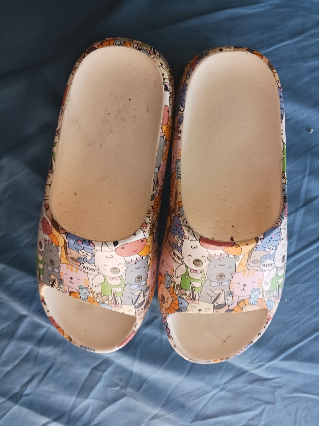 Cute cartoon print slides! These slides are perfect for lounging around the house or a quick trip outside. They do show some signs of wear on the soles, but the print is still vibrant and fun. Ready for a new adventure!