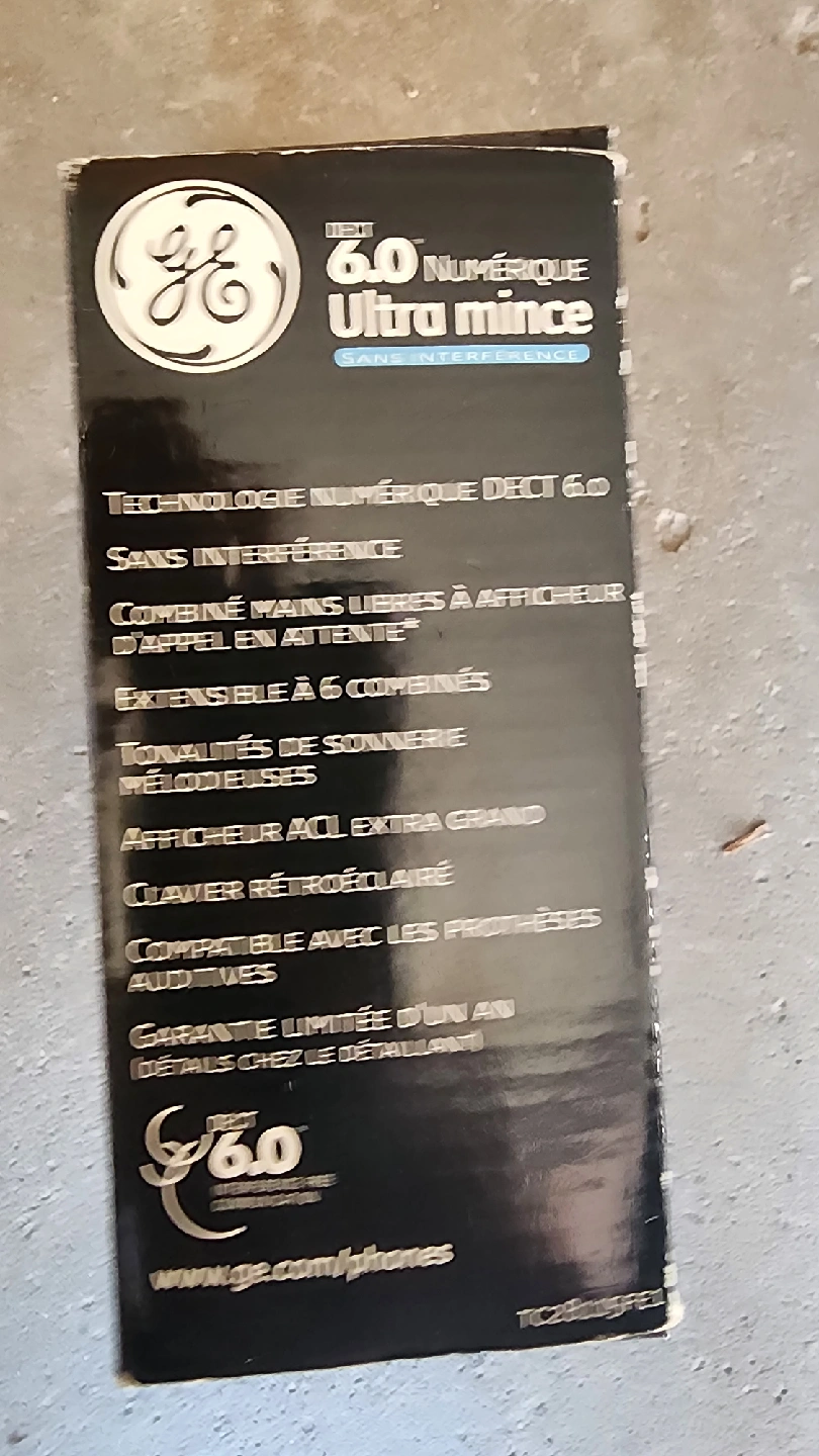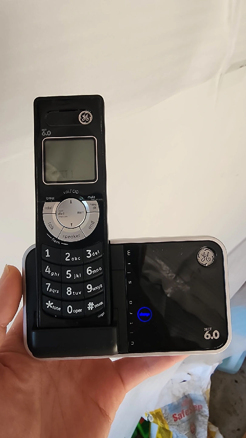 Selling a GE DECT 6.0 Digital Ultra Slim cordless phone. It comes with the base and handset. The phone is in great condition and includes the original box. It features a blue backlit LCD display and call waiting/caller ID