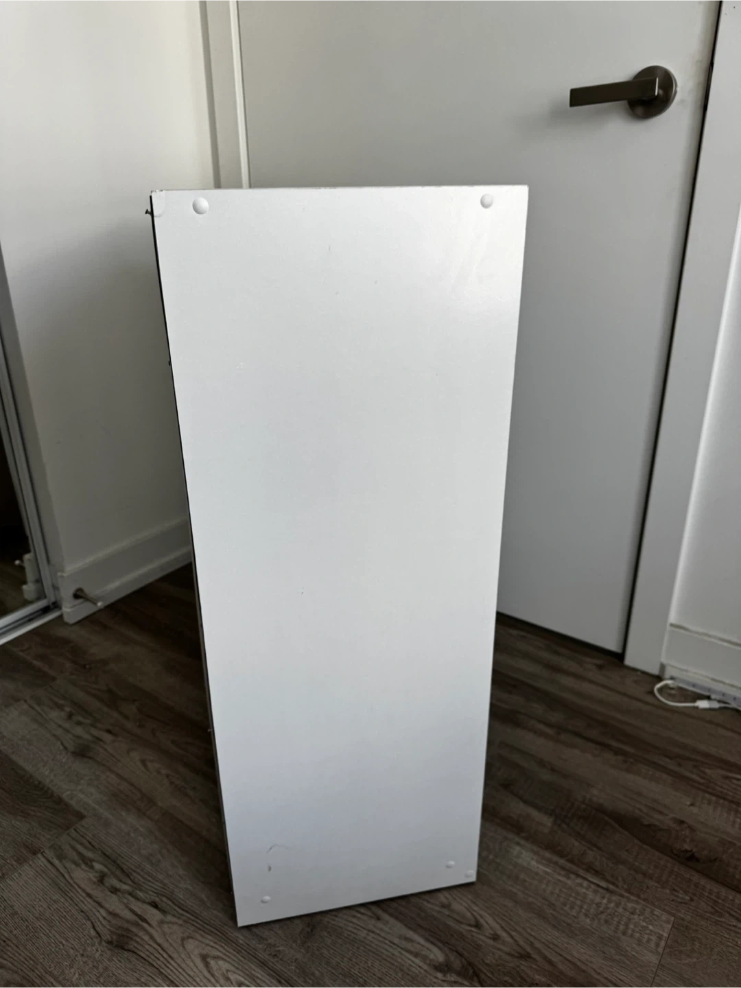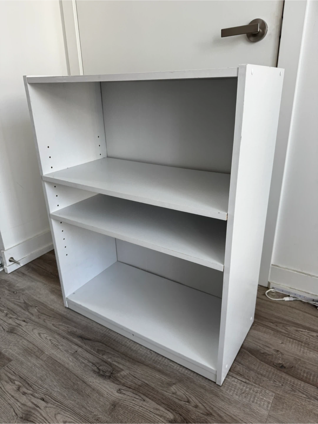 Selling a simple white bookcase with three shelves! It's perfect for storing books, displaying items, or organizing your space. The dimensions are approximately 30cm deep, 66cm wide, and 72cm tall.
