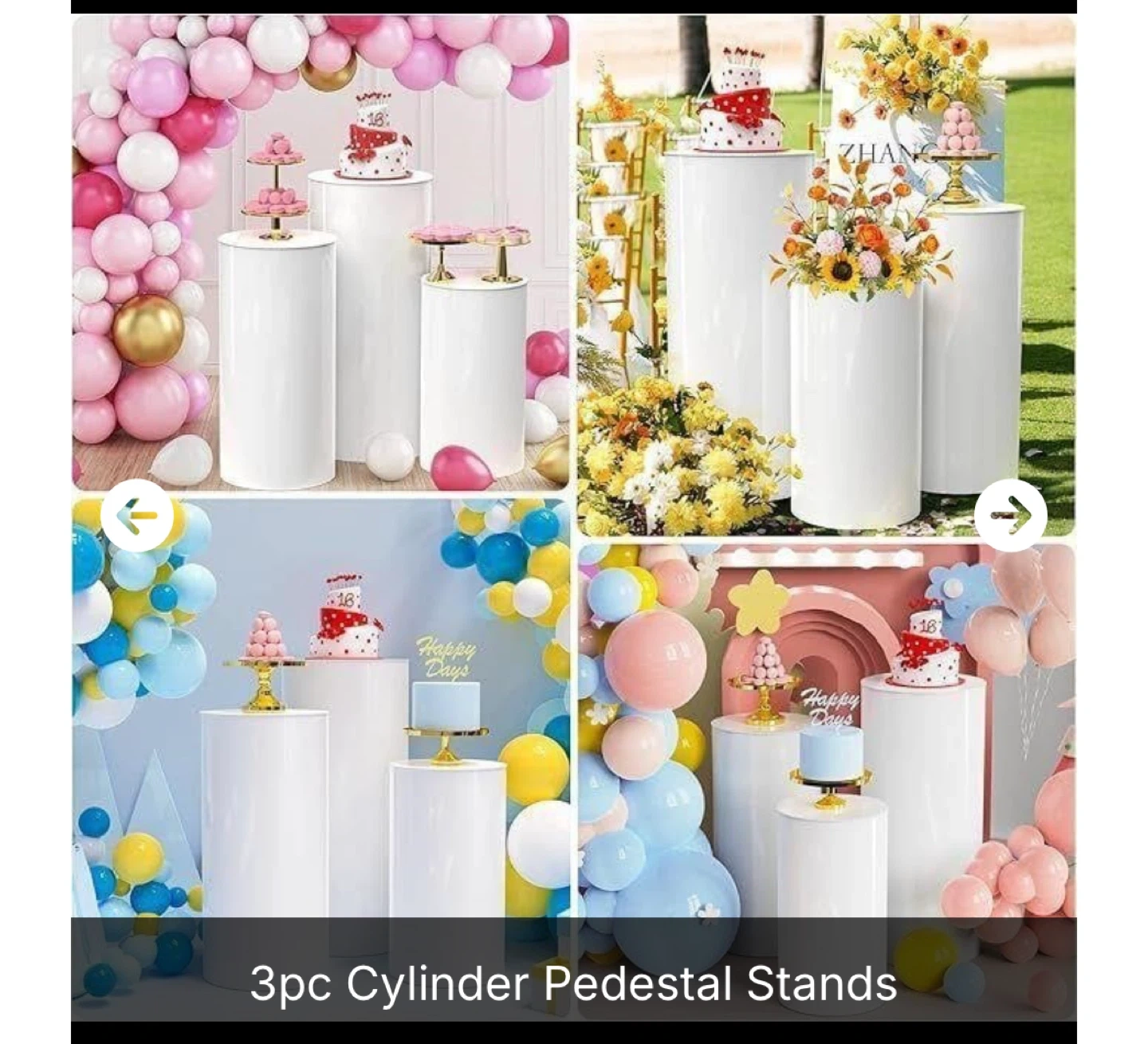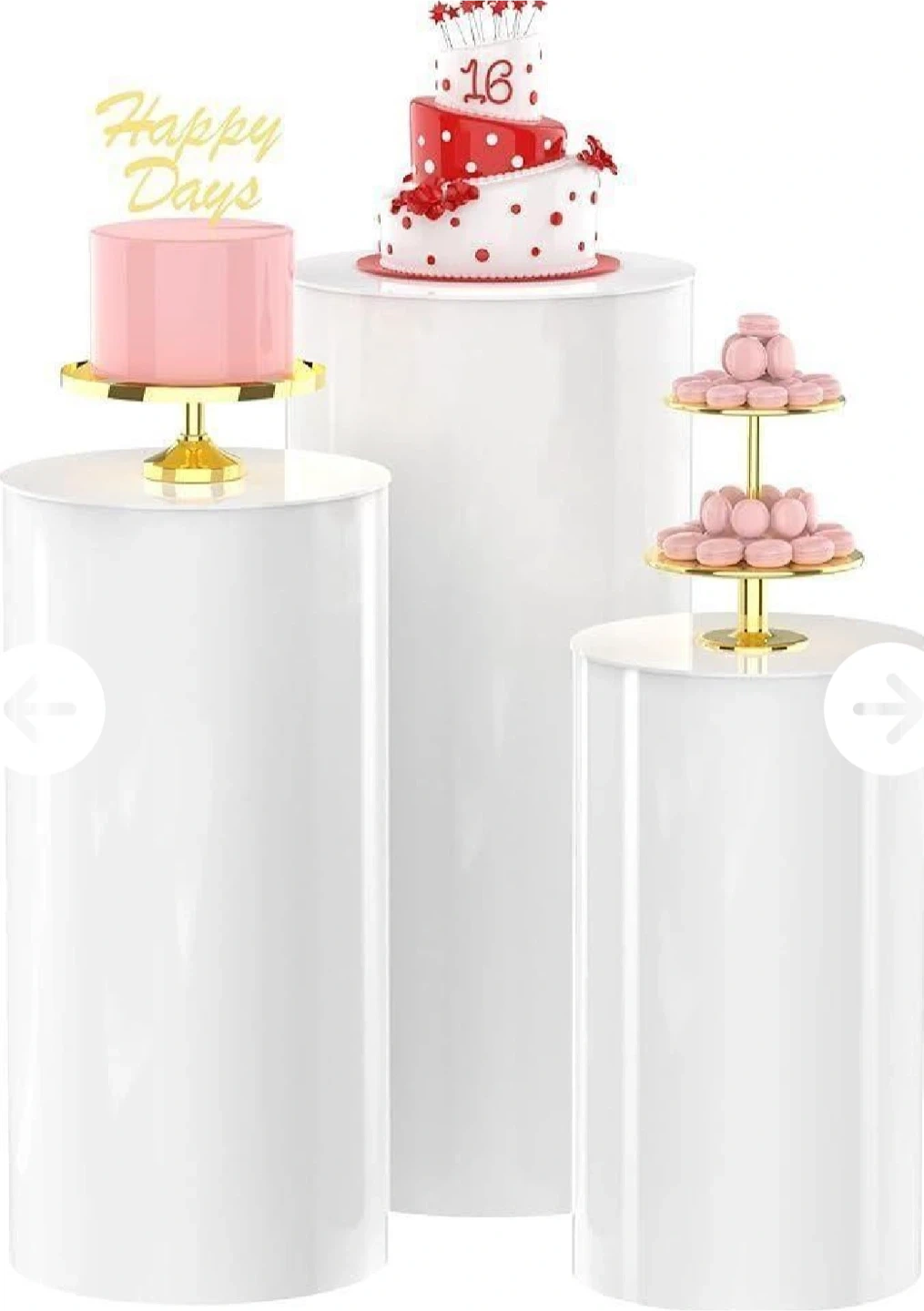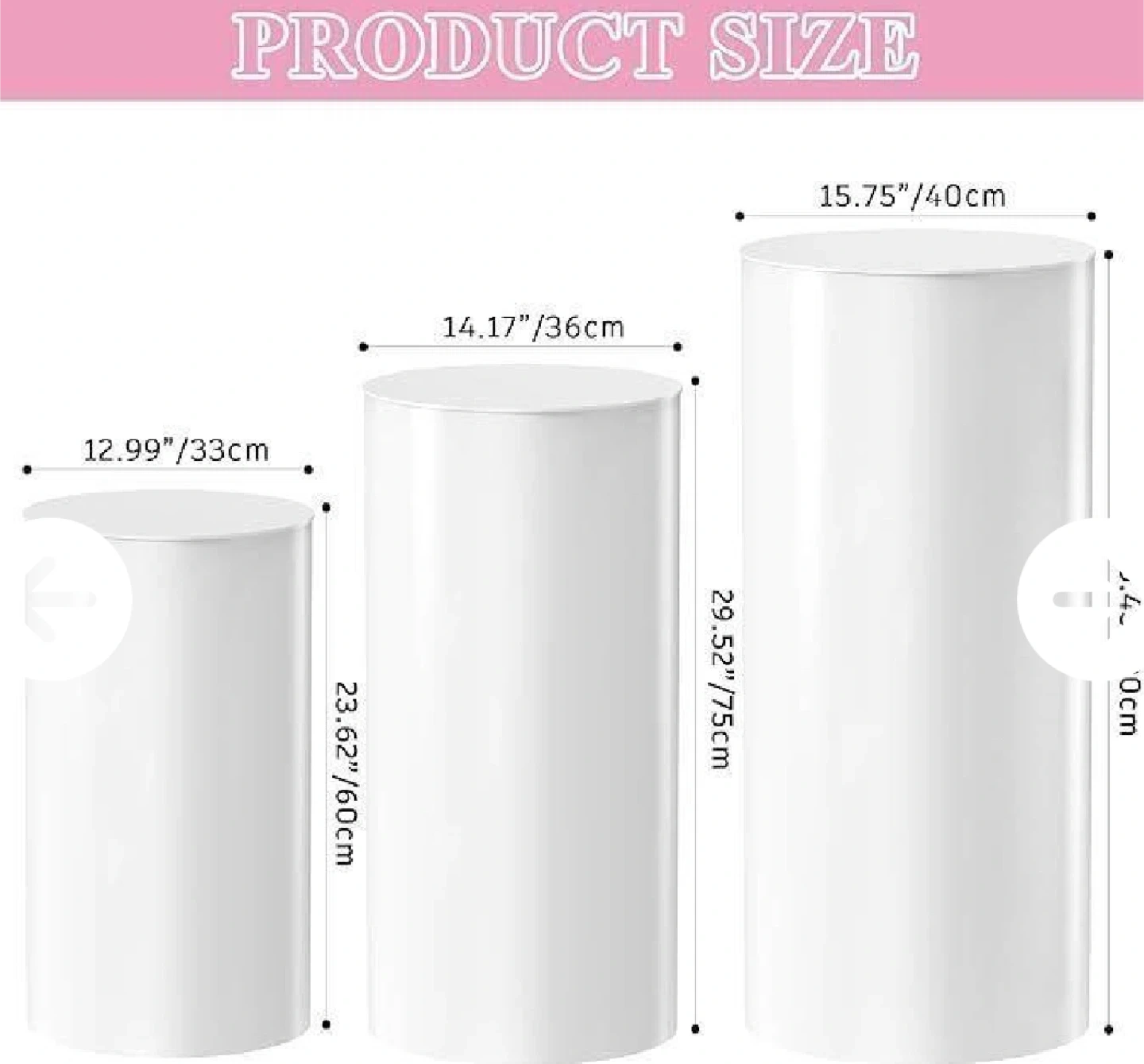 White Cylinder Stands for Parties - 3 Piece Set, Round. 35.43''(L),29.52''(M),23.62''(S) Brand New in Box. $125 Reg. Price $225 +HST