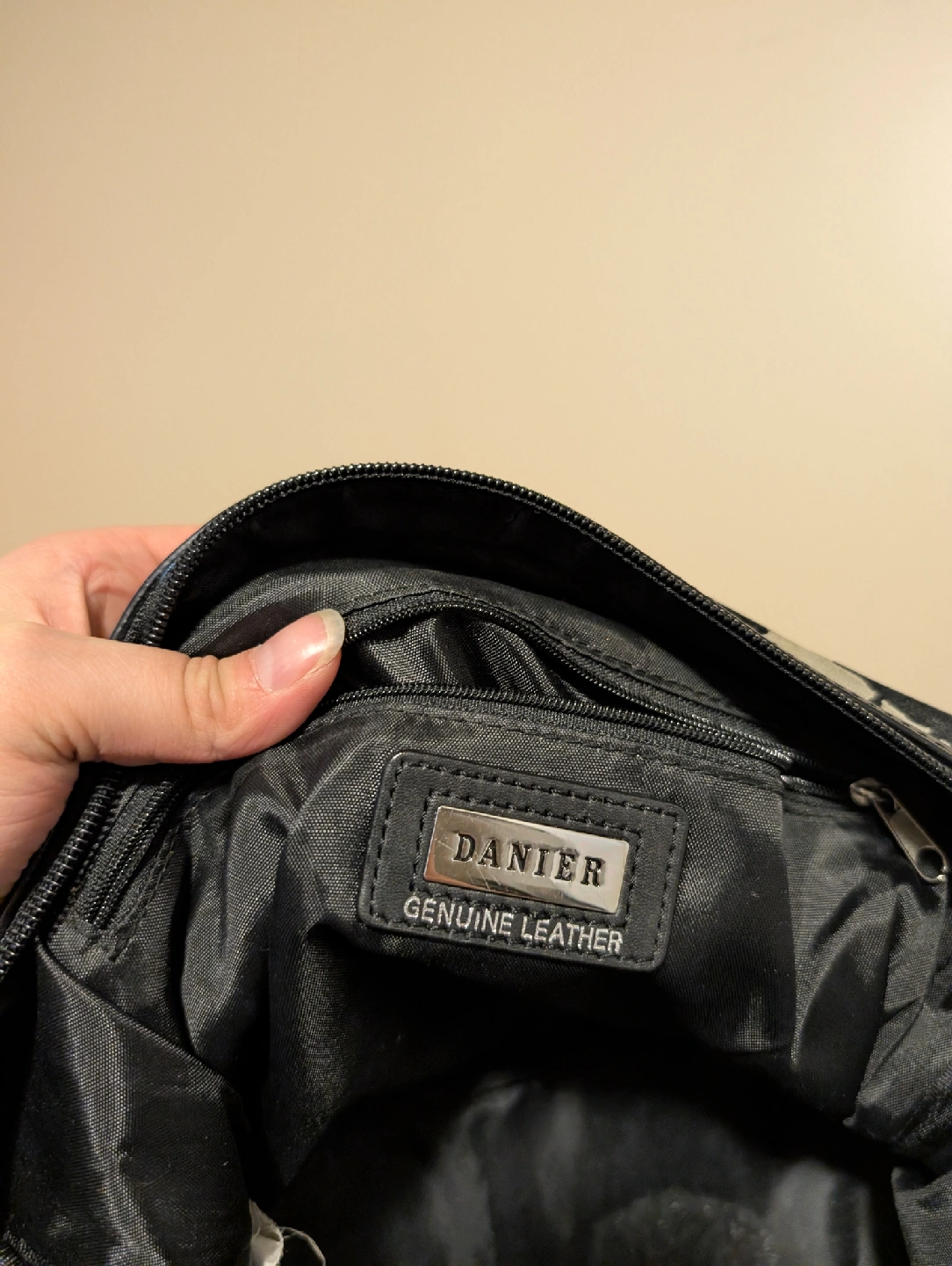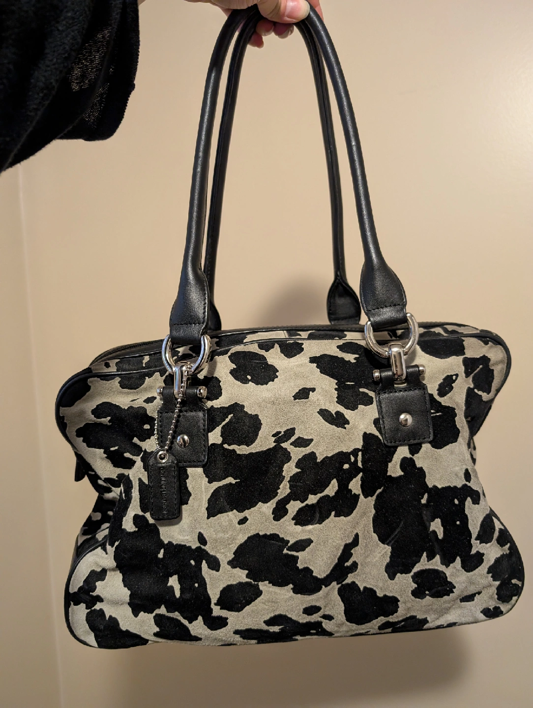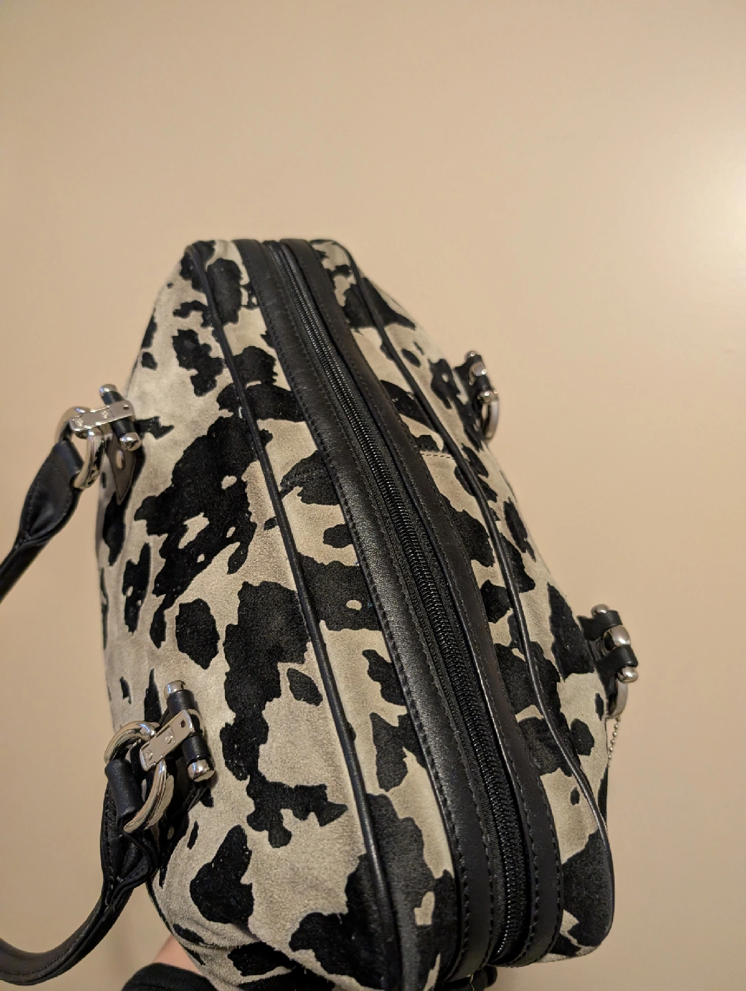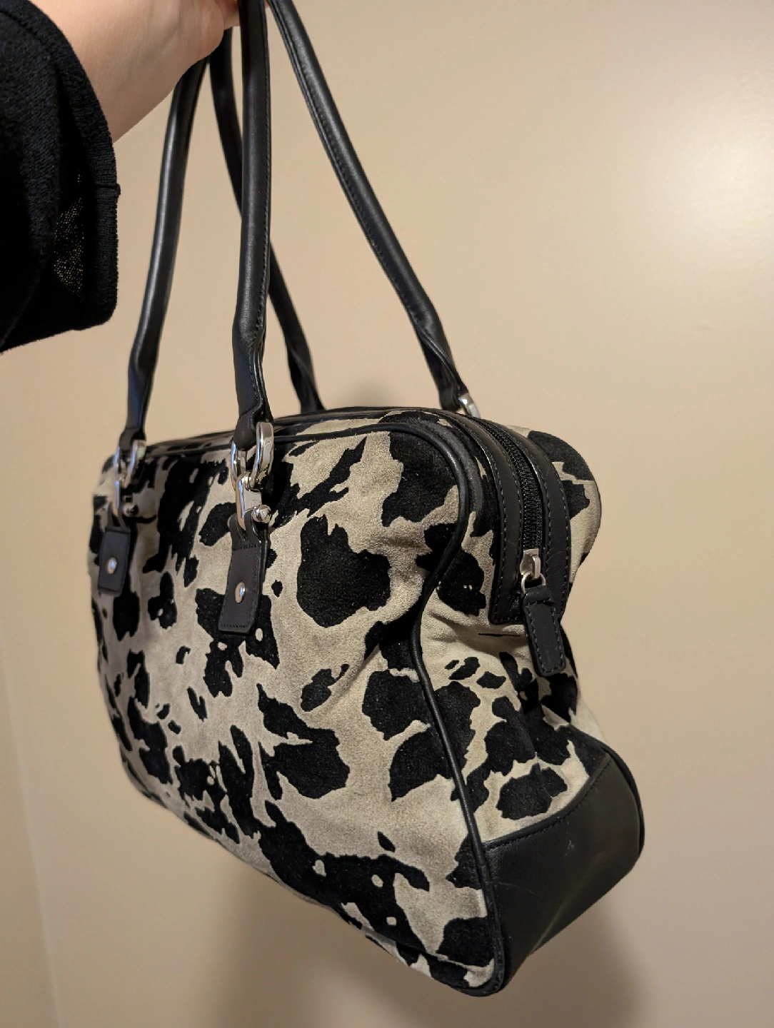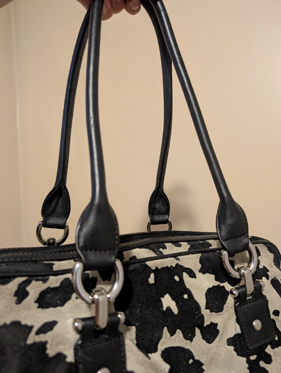 Danier handbag made with genuine leather! It features a unique cow print design in black and white. Perfect for adding a touch of fun to any outfit