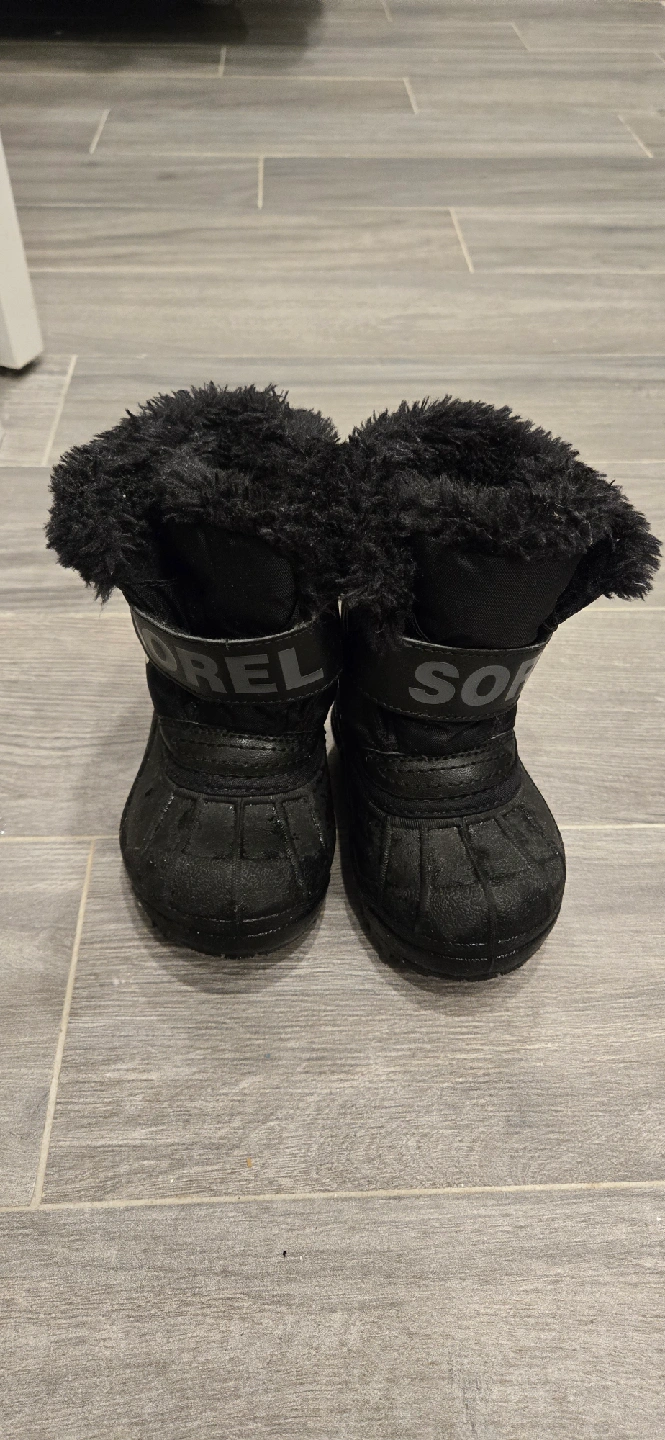 Selling a pair of Sorel Toddler Snow Commander winter boots in size 5-6. They're black and in great condition, ready for some winter fun!
