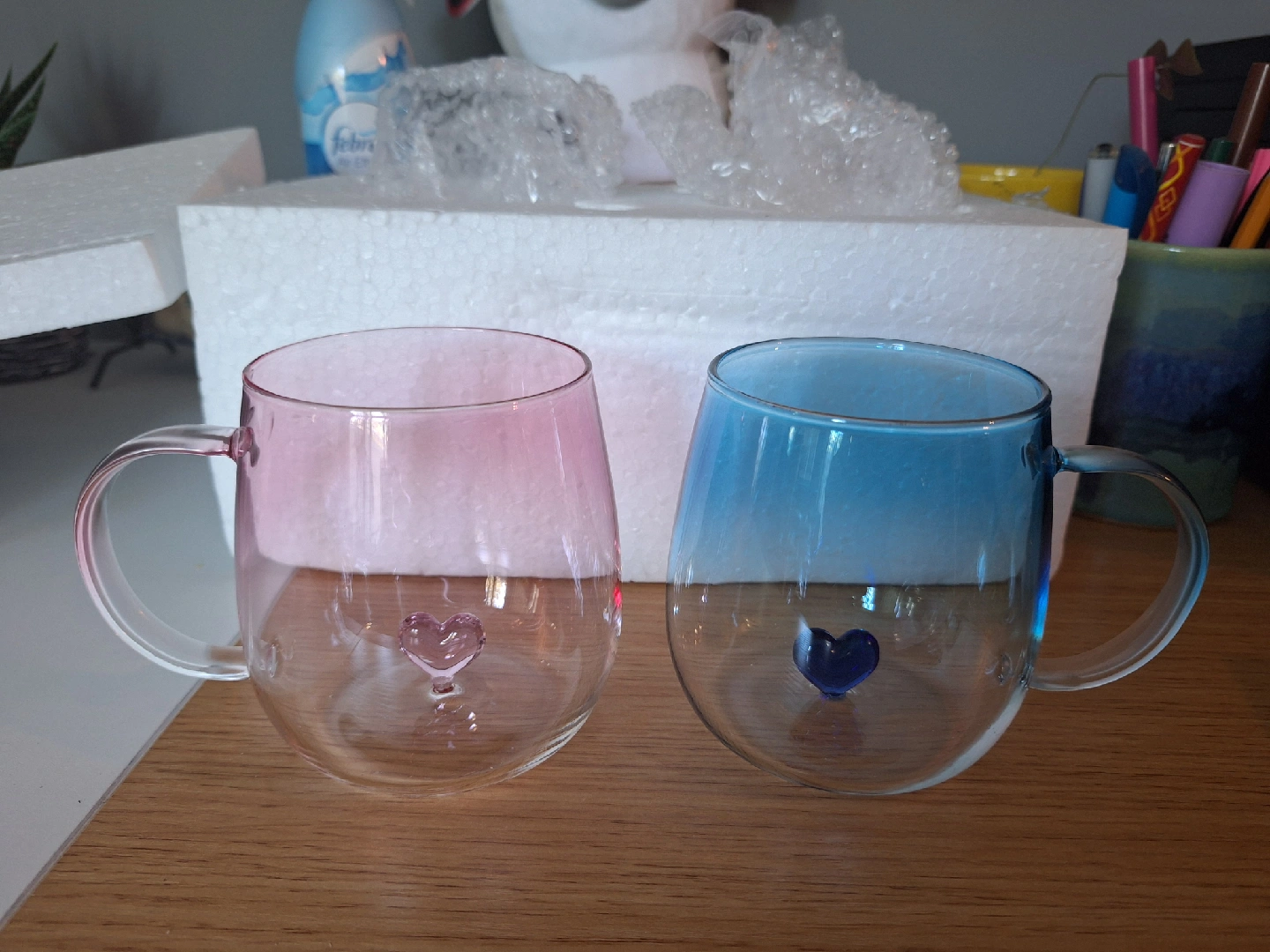 Selling a set of two adorable glass coffee mugs! One is a lovely blue and the other is a pretty pink, both with a cute heart design inside. These mugs are perfect for adding a touch of charm to your morning coffee or tea. They're brand new and ready to find a new home! π