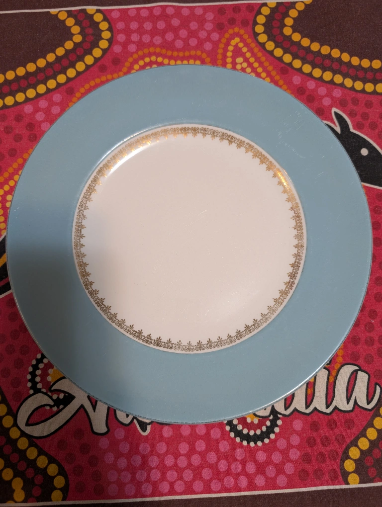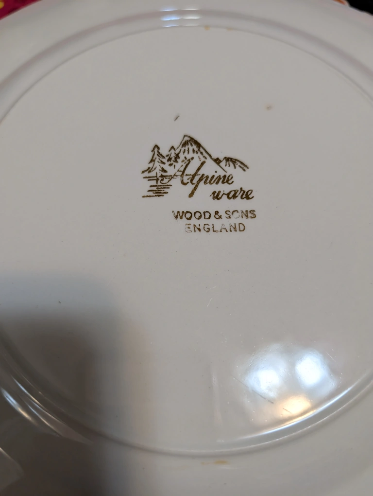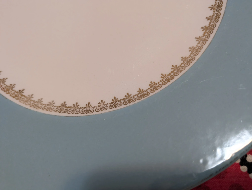 Lovely vintage Alpine Ware plate by Wood & Sons England! It features a beautiful light blue colour with gold detailing around the rim. There are some signs of wear, as shown in the photos, but it's still a charming piece for your collection or table setting. There is a small defect on the back from the kiln firing as well as a small crack as shown in the picture. #free Pick up only, in Beltline neighbourhood. FCFS. I'm flexible on pick up times but please don't no-show.