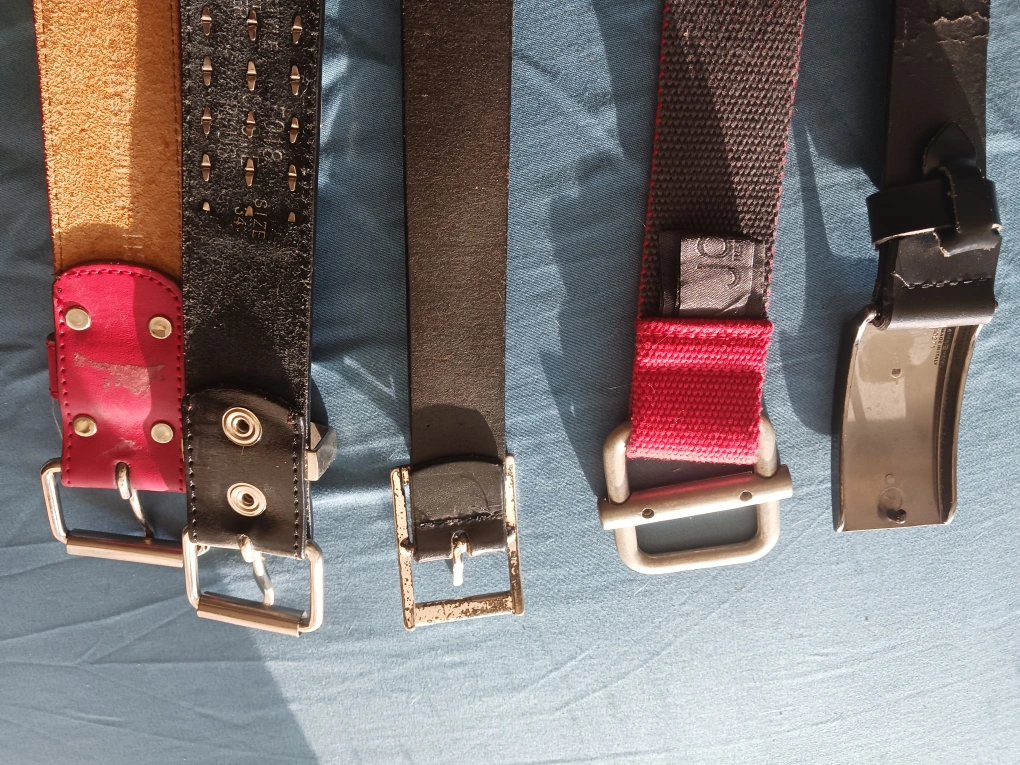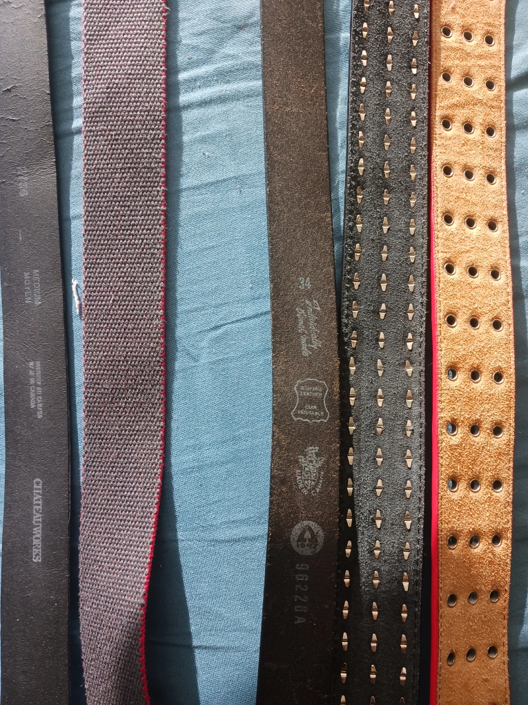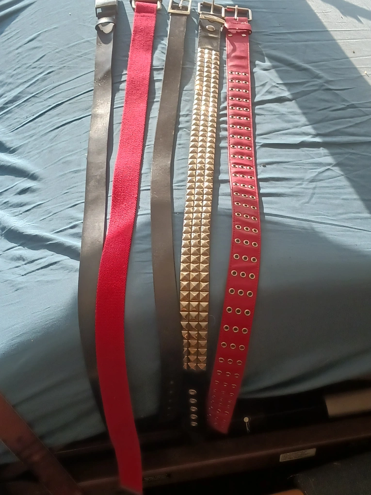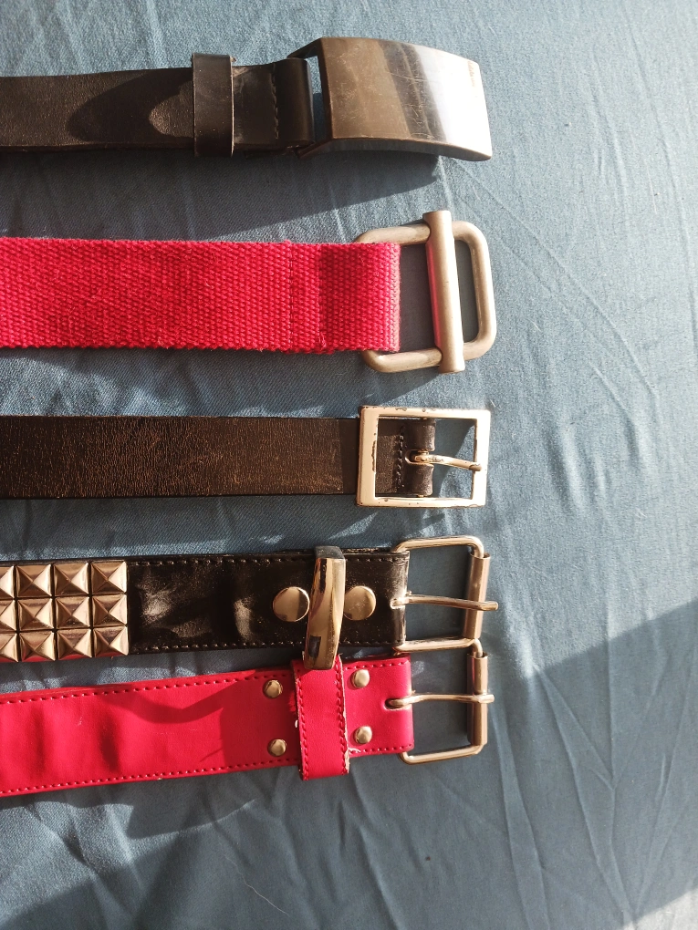 Selling a collection of assorted belts! There's a variety of styles and sizes available. You'll find leather, fabric, and studded designs. Some brands include Chateau Cours and others. Check out the pictures to see the details! Sold $8 per. 1. Solid buckle, balck leather 2. Red canvas 3. Small buckle, black leather 4. SOLD 5. SOLD