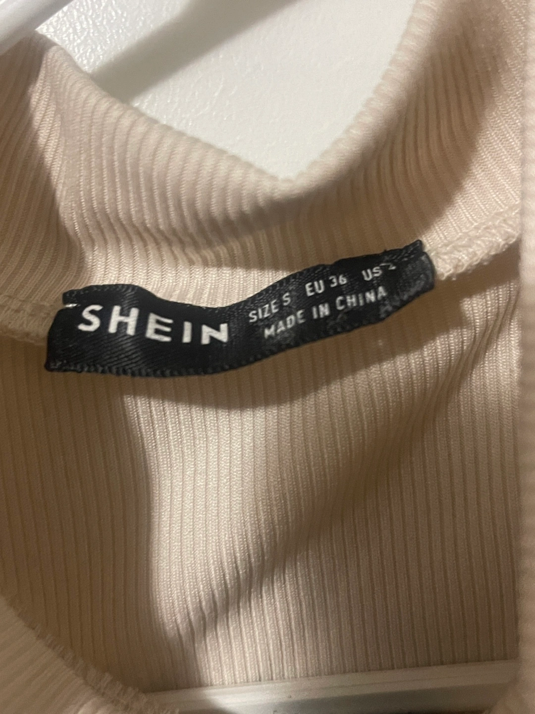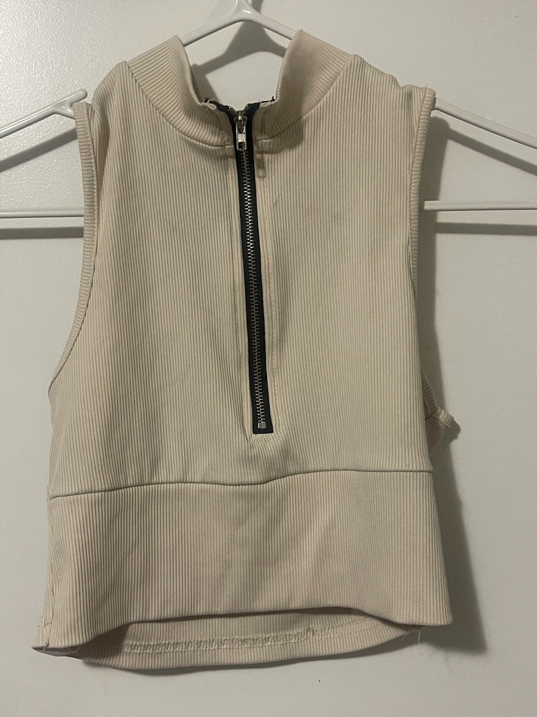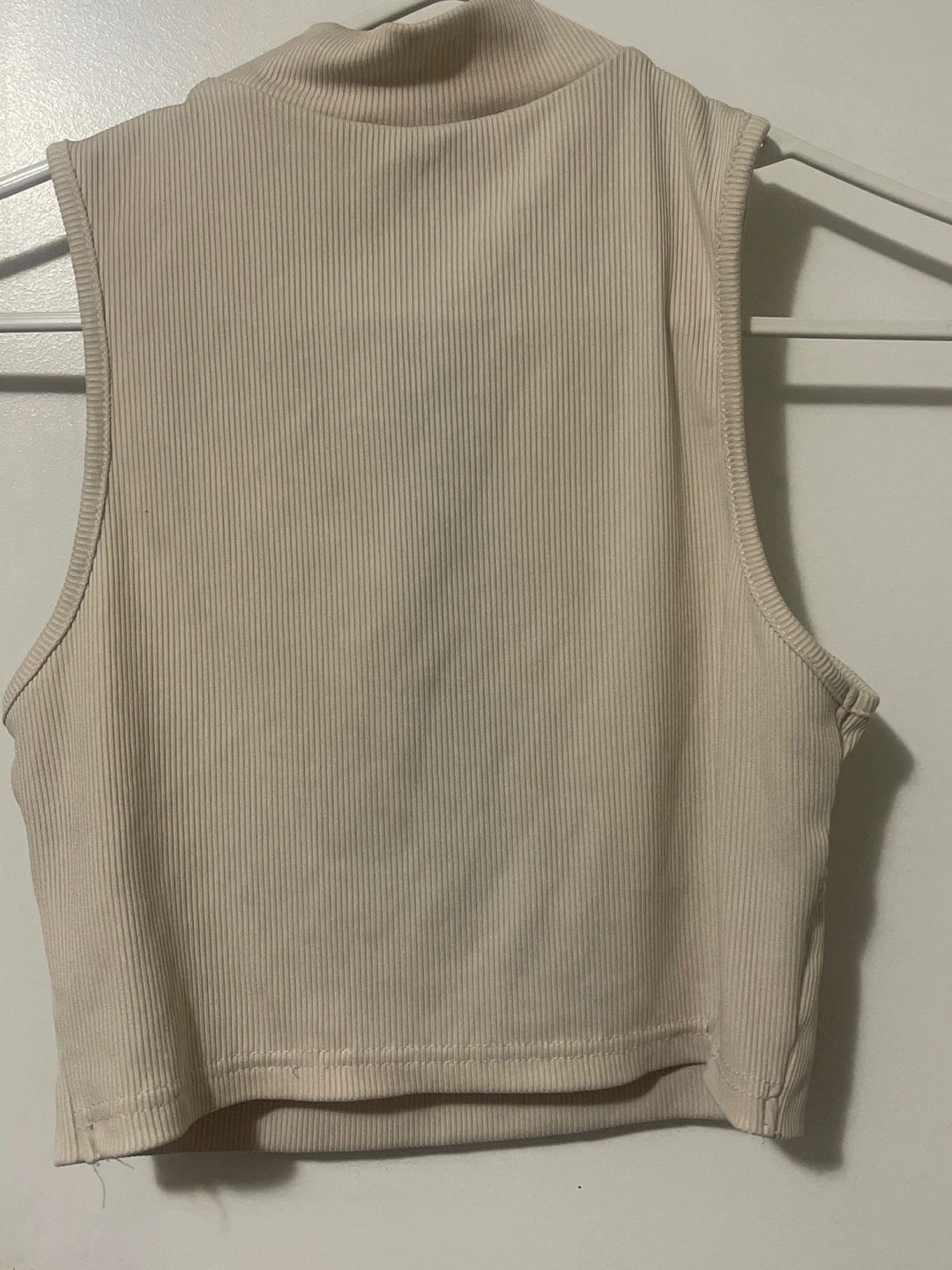 Selling a SHEIN sleeveless ribbed crop top. It's a size small and in great condition. The top features a mock neck with a zipper detail. Perfect for a casual look!