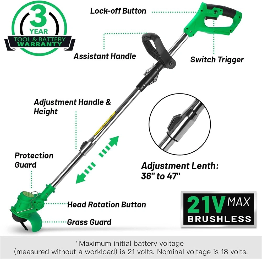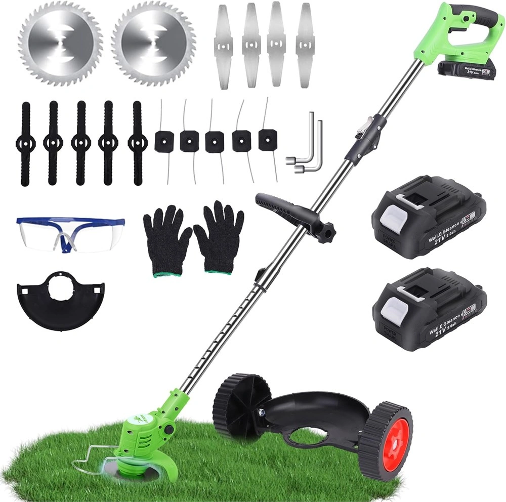 Refer last pictures for details - looks good Charger There is no US standard charger inside the lawn mower. 3-in-1 Multifunctional Design This cordless weed eater is equipped with three types of blades. The plastic blade is used for trimming delicate grass and leaves; the metal blade can cut through thickets of weeds and small shrubs; the saw blade can handle thicker branches.