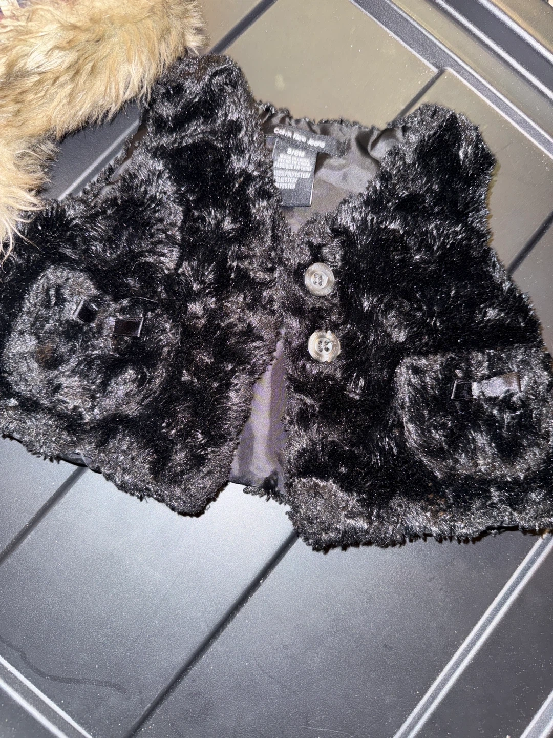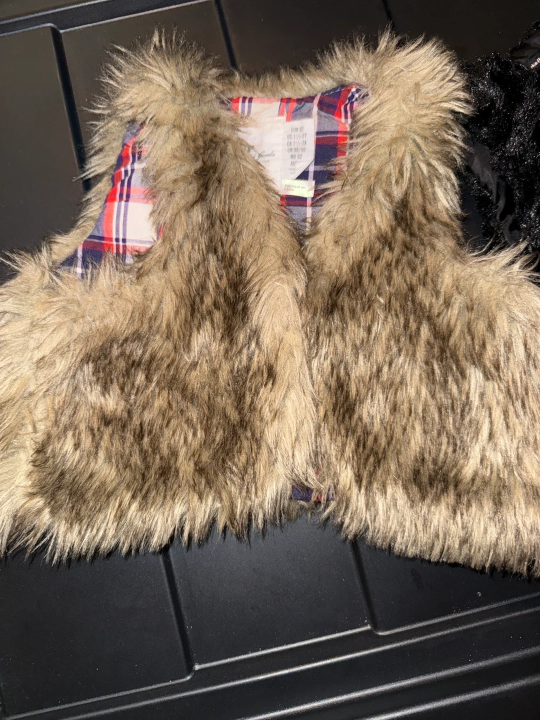 Selling a bundle of two adorable faux fur vests! One is a tan/brown colour with a plaid lining. The other is black with button closures. Both are sized 12-18 months and would be perfect for layering!