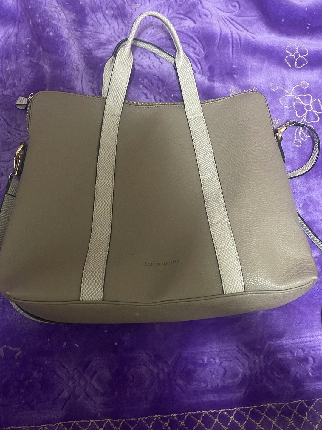 Selling a Louenhide tote bag in a lovely beige colour. It's in great condition and perfect for everyday use or as a work bag. The interior has a striped lining. It features both handles and a shoulder strap for versatile carrying options