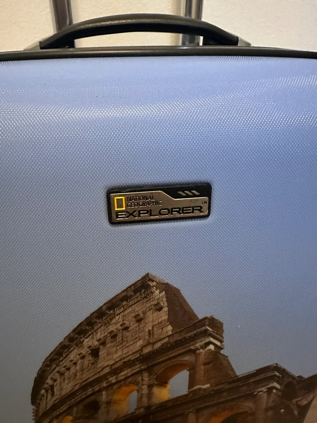 Selling a National Geographic Explorer carry-on suitcase. It features a light blue colour with a picture of the Colosseum. Perfect for your next trip!